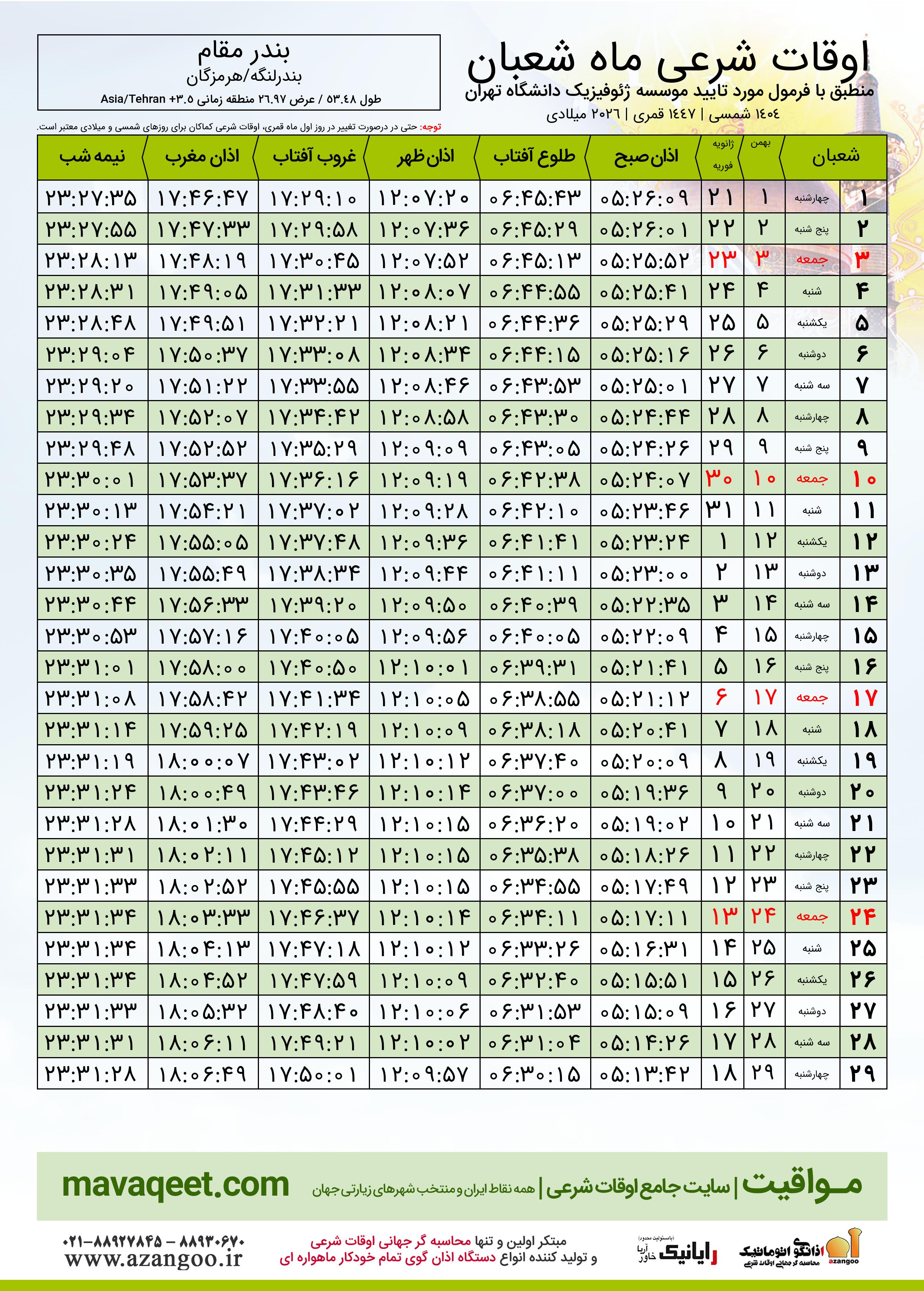اوقات شرعی ماه شعبان ١٤٤٧ هـ.ق شهر بندر مقام بر