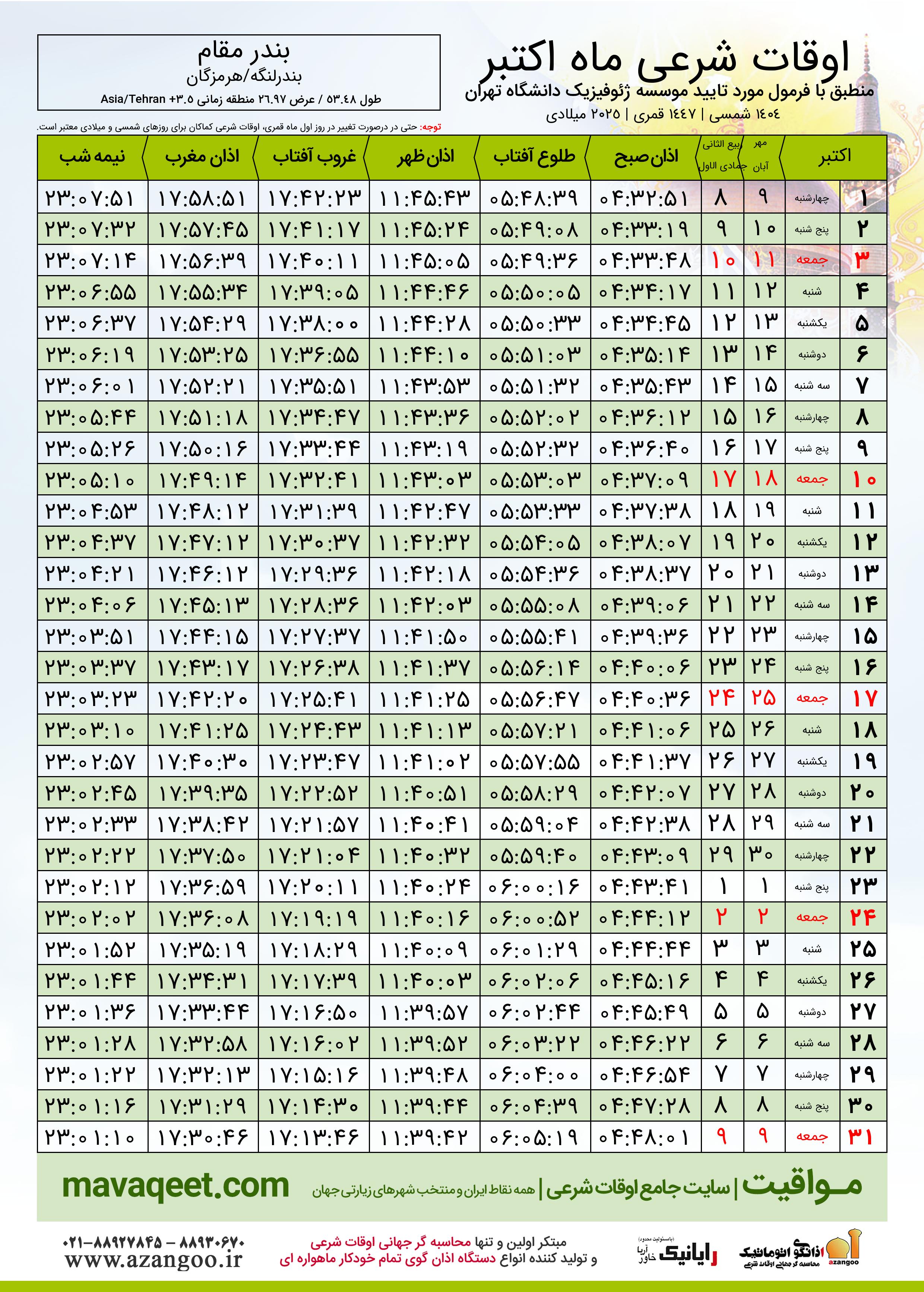 دانلود اوقات شرعی اکتبر ٢٠٢٥ شهر بندر مقام