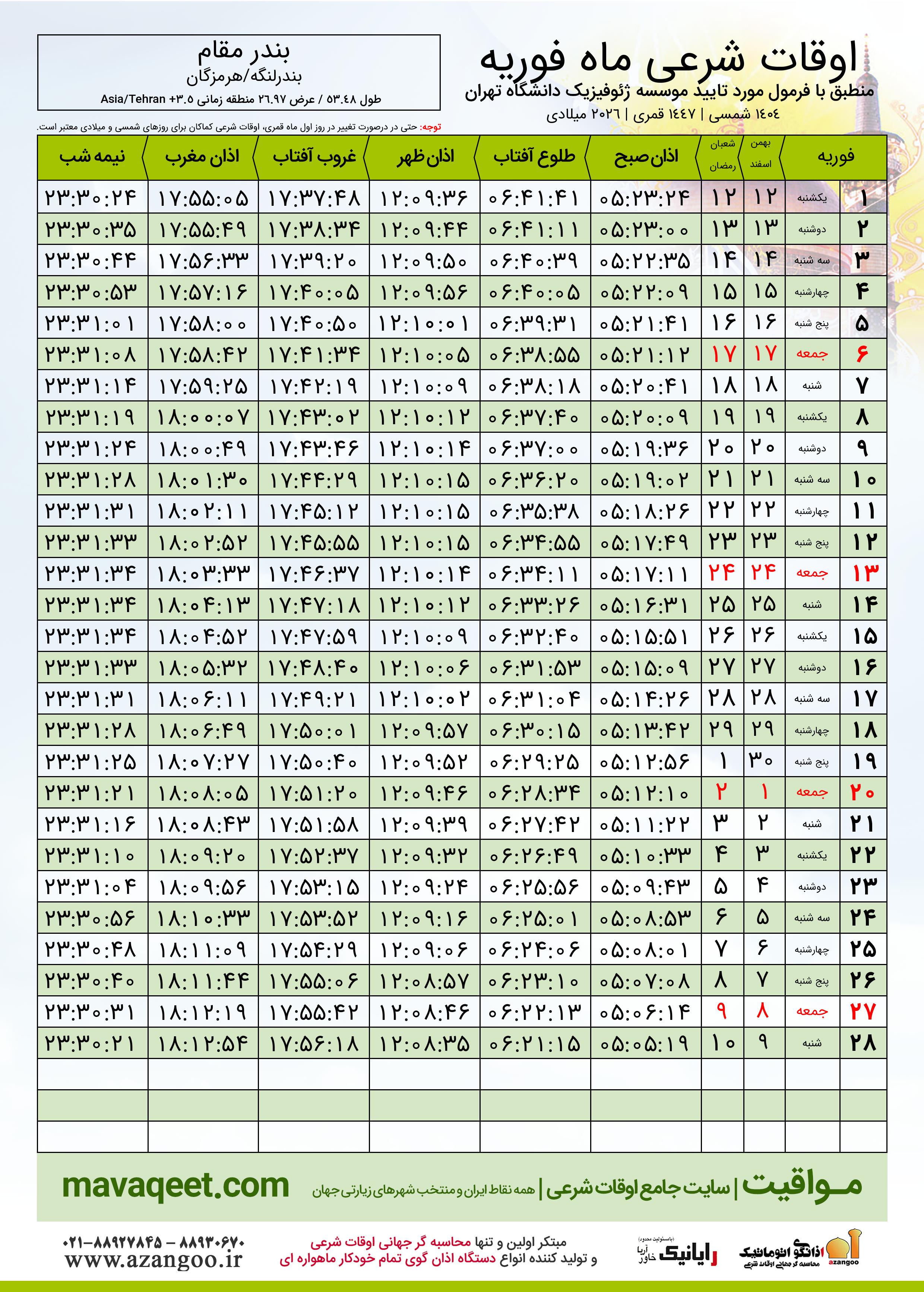 دانلود اوقات شرعی ماه رمضان ٠٤ - ١٤٠٤ شمسی | ٢٠٢٦ میلادی | ١٤٤٧ قمری شهر بندر مقام