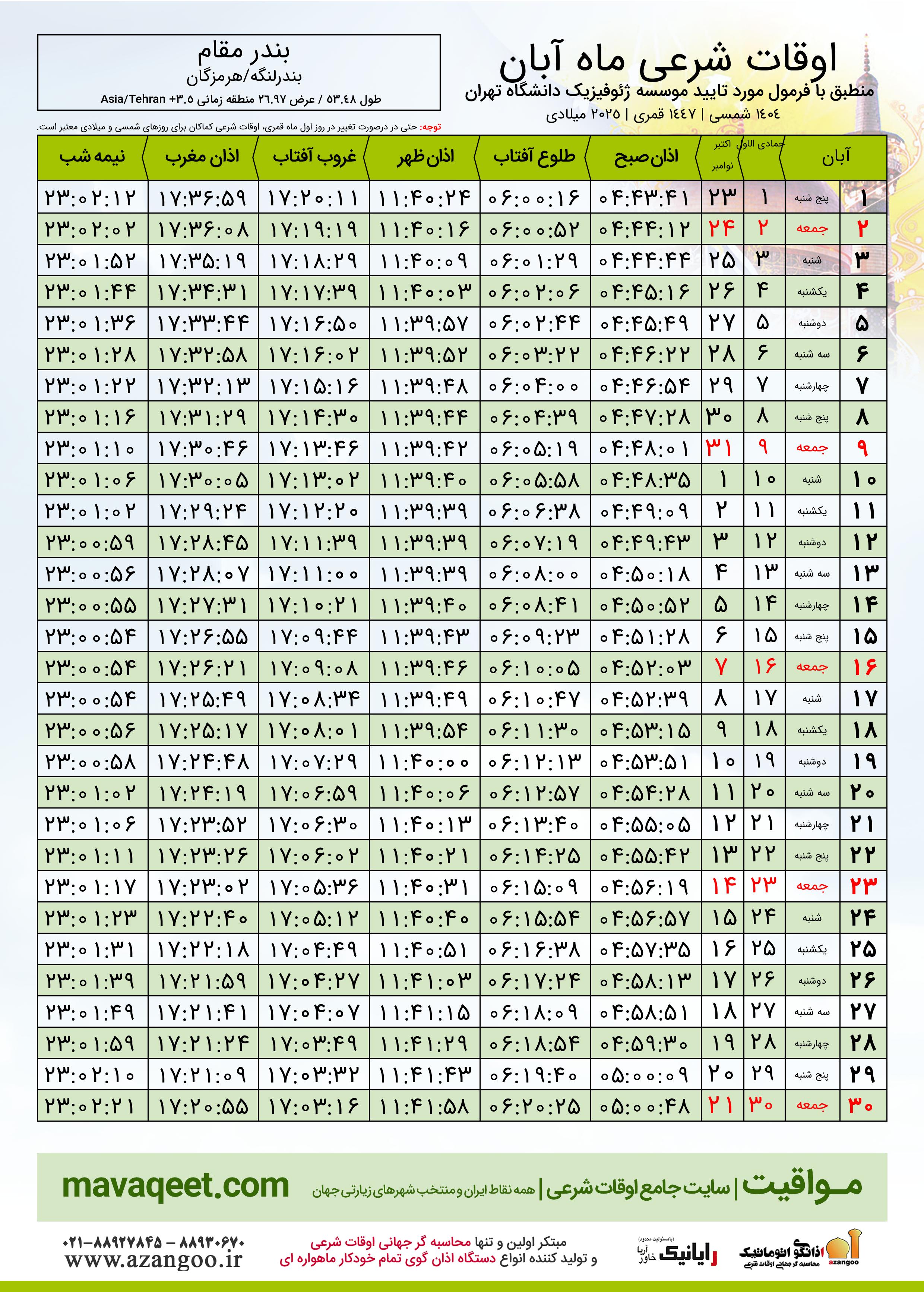 جدول اوقات شرعی آبان ١٤٠٤ شمسی شهر بندر مقام