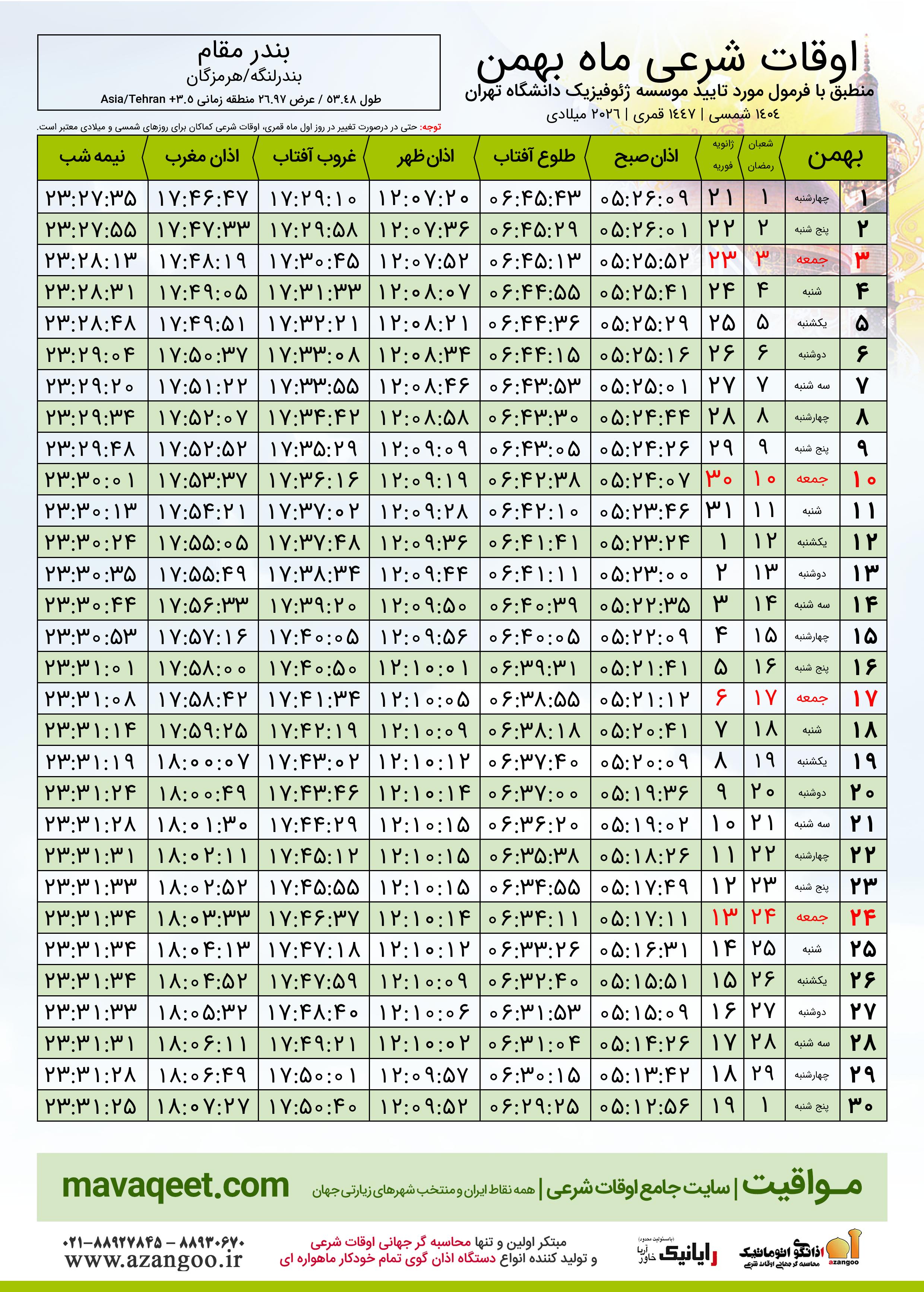 دانلود اوقات شرعی بهمن ٠٤ - ١٤٠٤ شهر بندر مقام