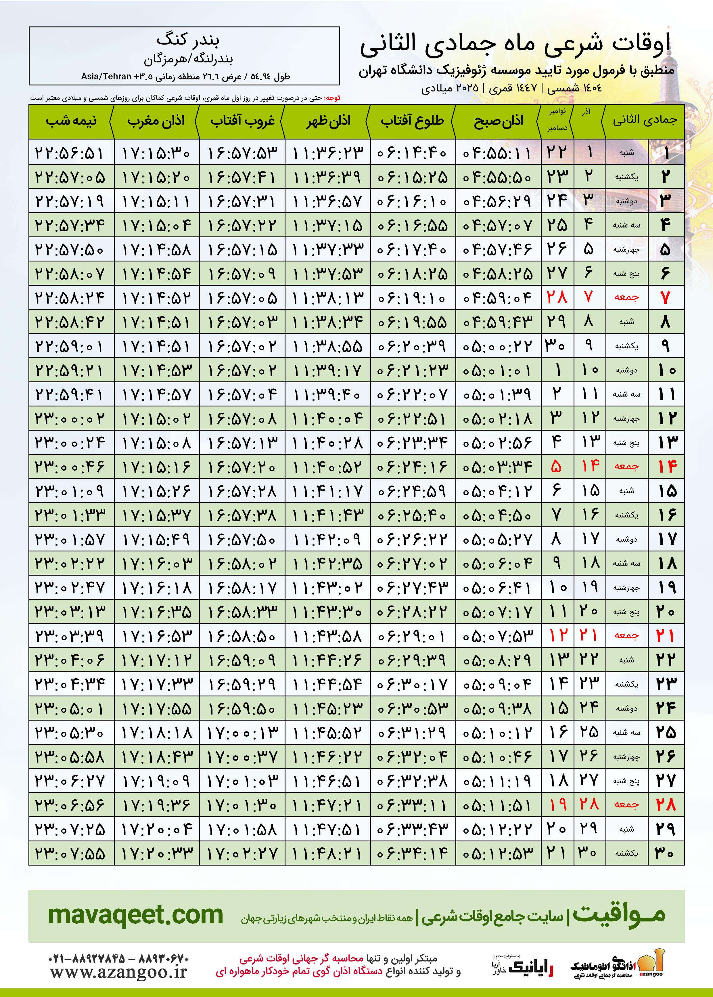 اوقات شرعی ماه جمادی الثانی ١٤٤٧ هـ.ق شهر بندر کنگ بر