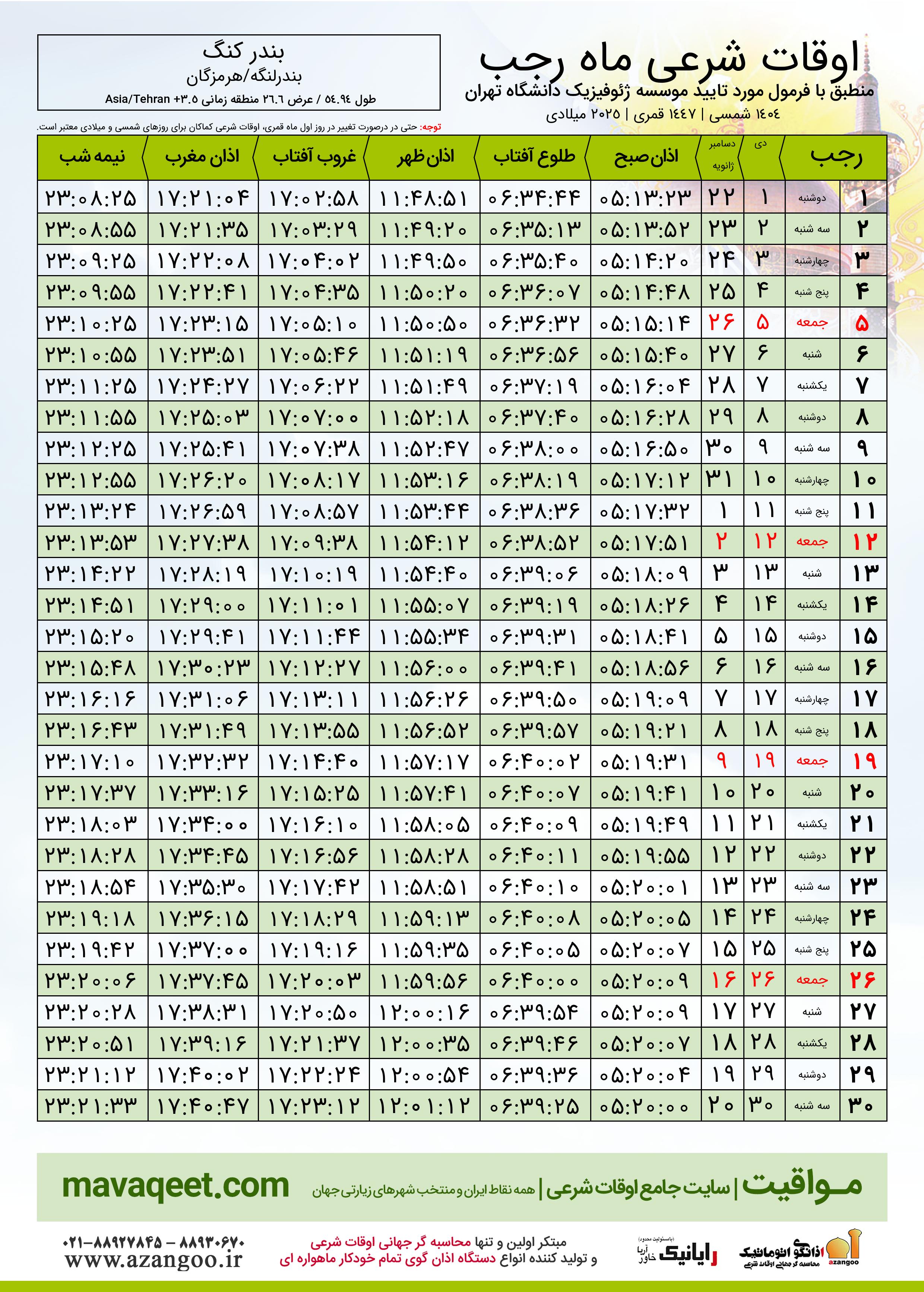 اوقات شرعی ماه رجب ١٤٤٧ هـ.ق شهر بندر کنگ بر