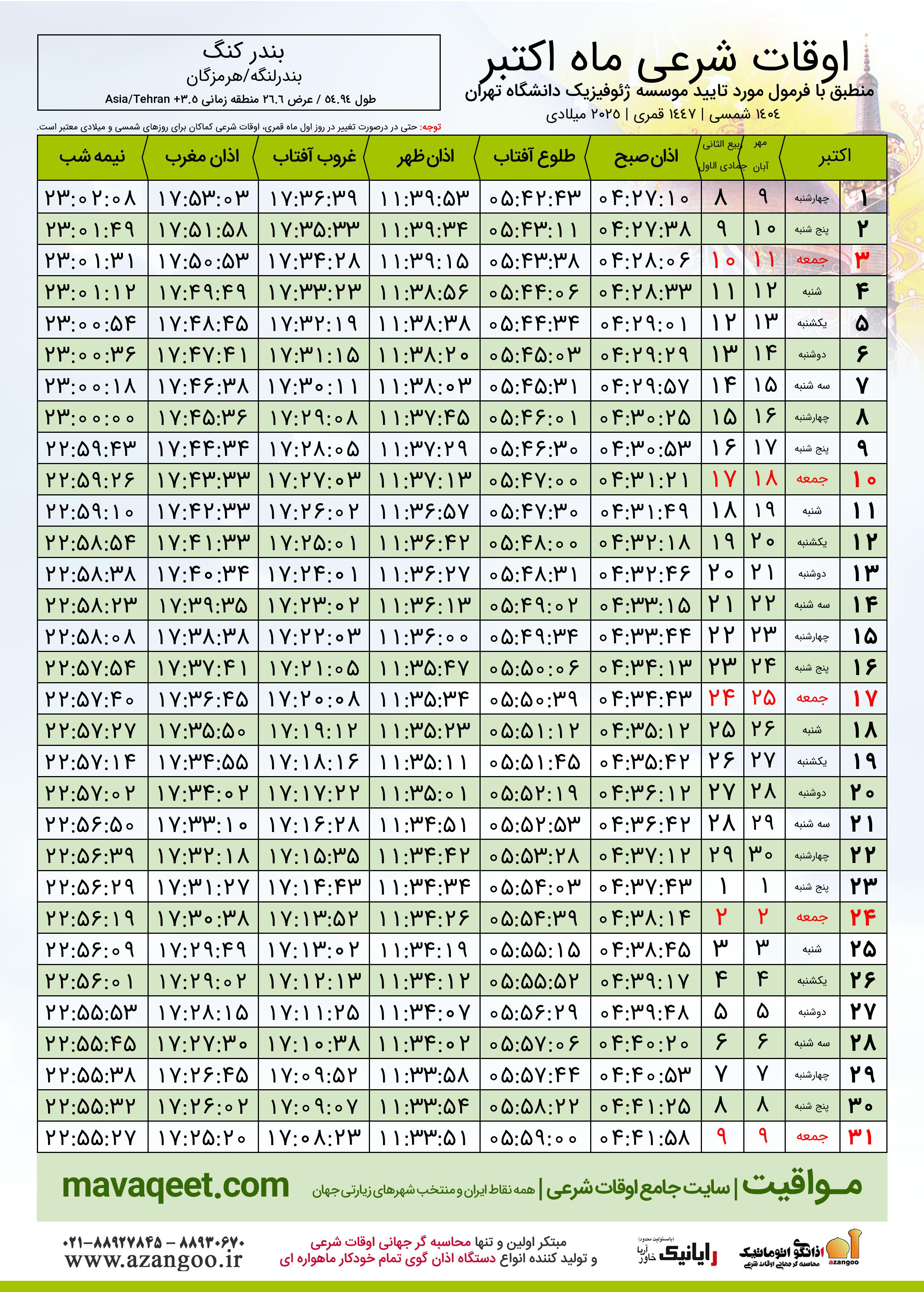 دانلود اوقات شرعی اکتبر ٢٠٢٥ شهر بندر کنگ