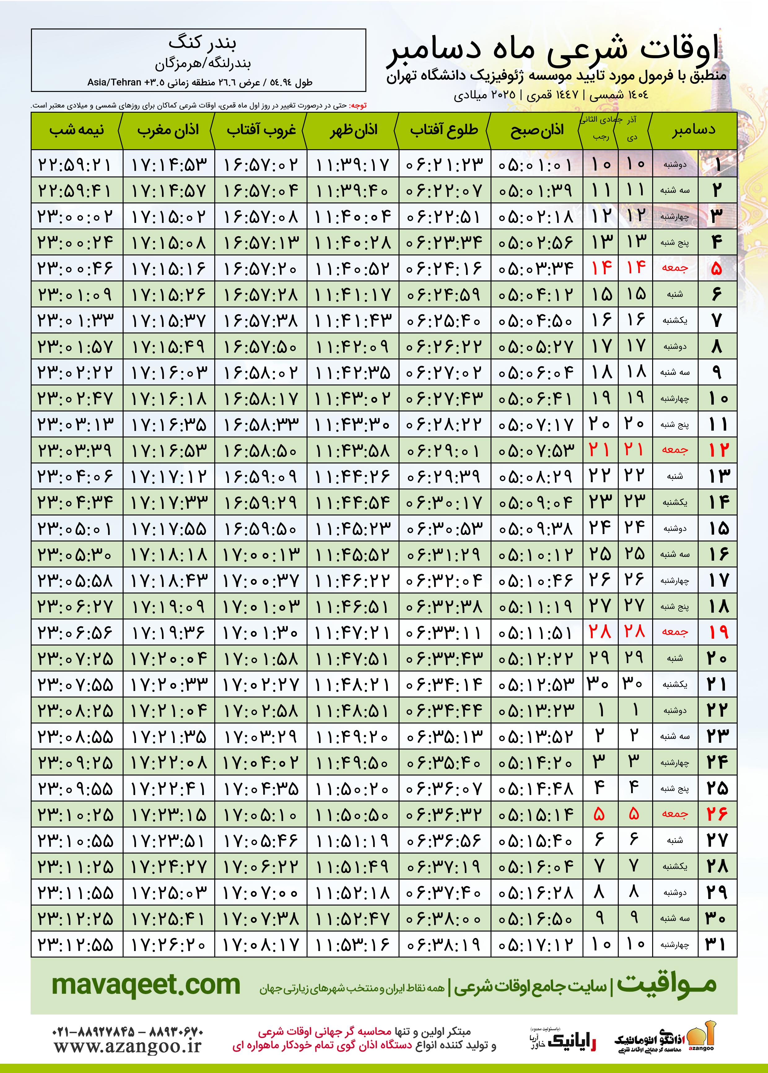 دانلود اوقات شرعی دسامبر ٢٠٢٥ شهر بندر کنگ