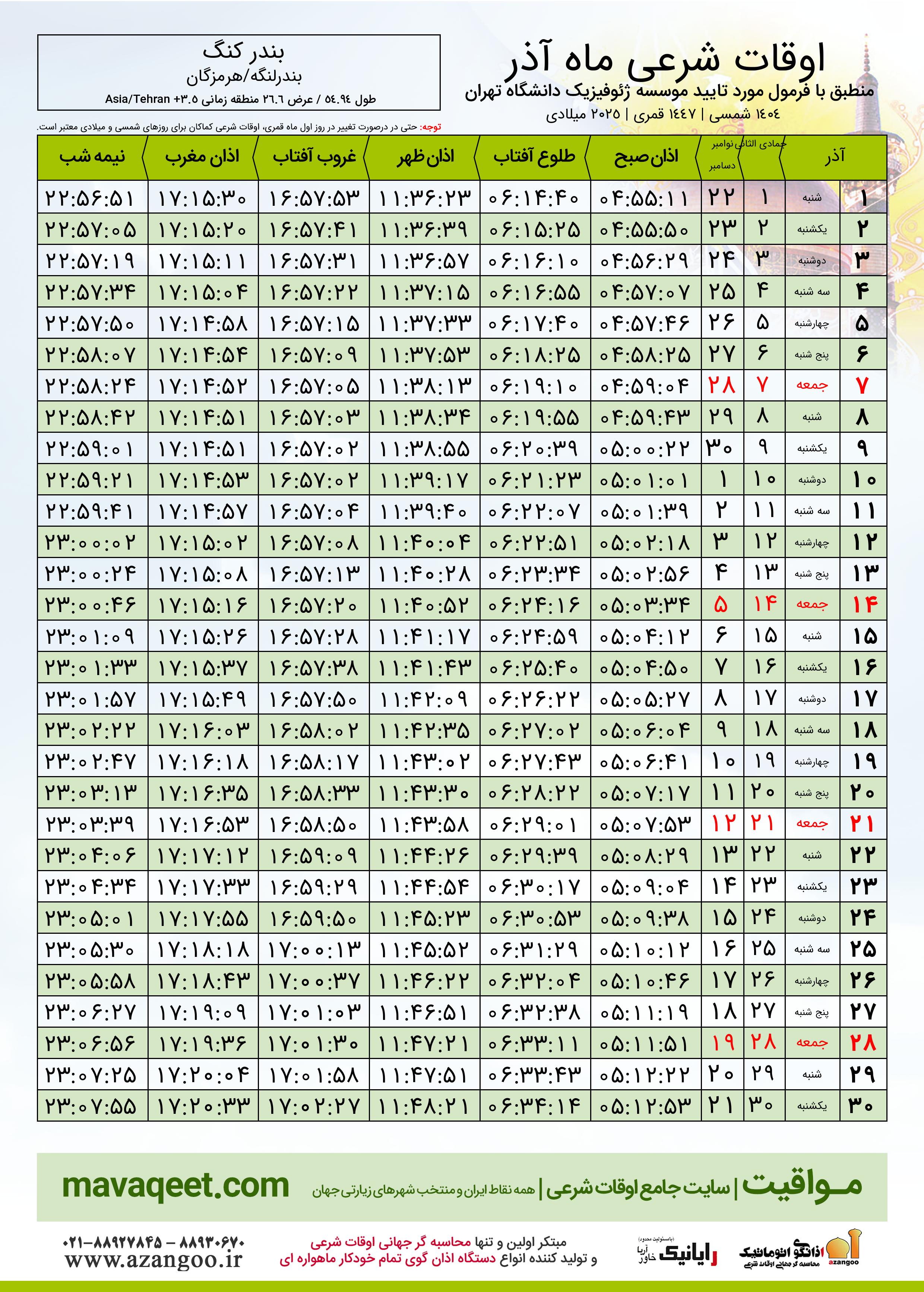 دانلود اوقات شرعی آذر ٠٤ - ١٤٠٤ شهر بندر کنگ