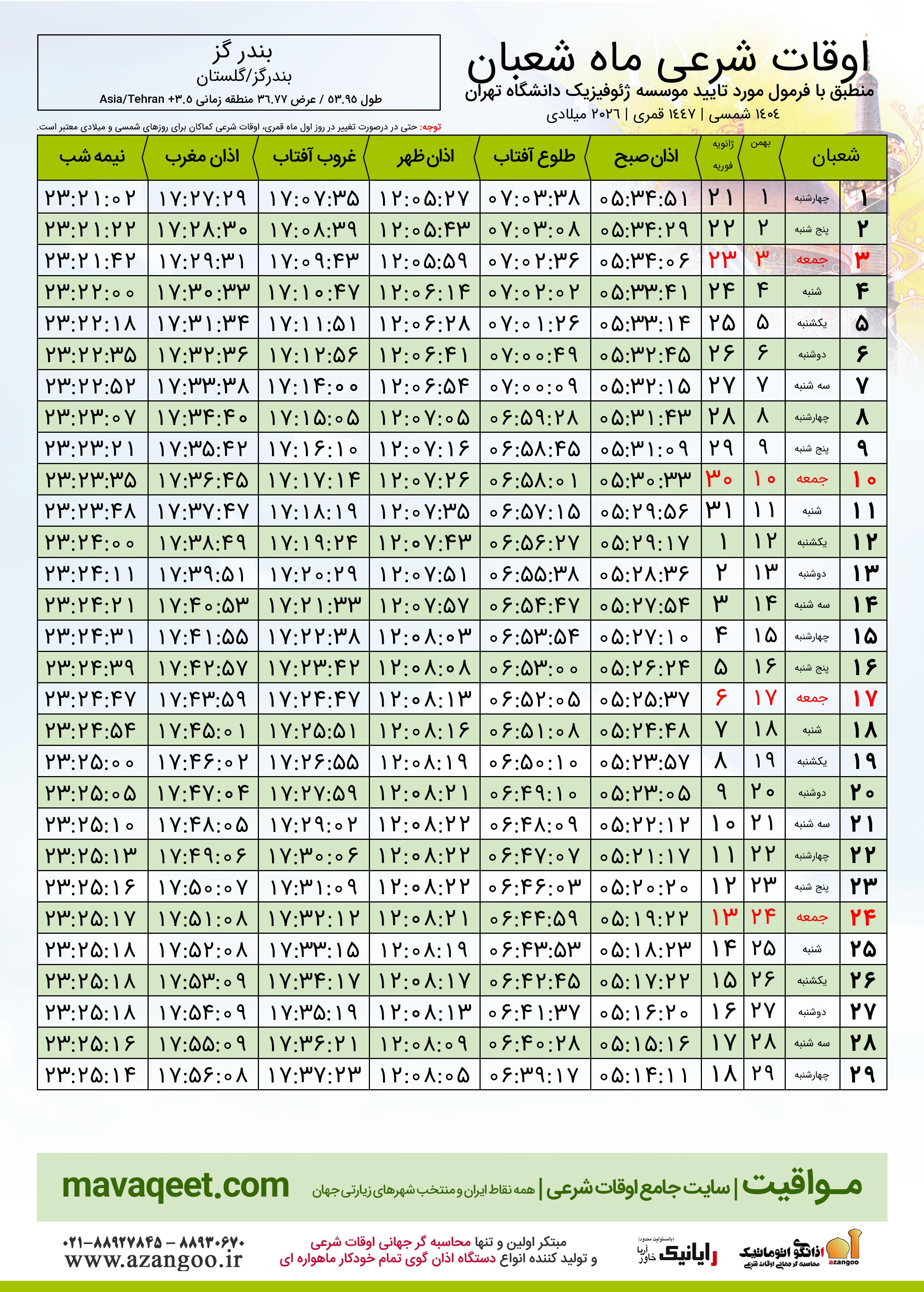اوقات شرعی شعبان ١٤٤٧ شهر بندر گز + دانلود