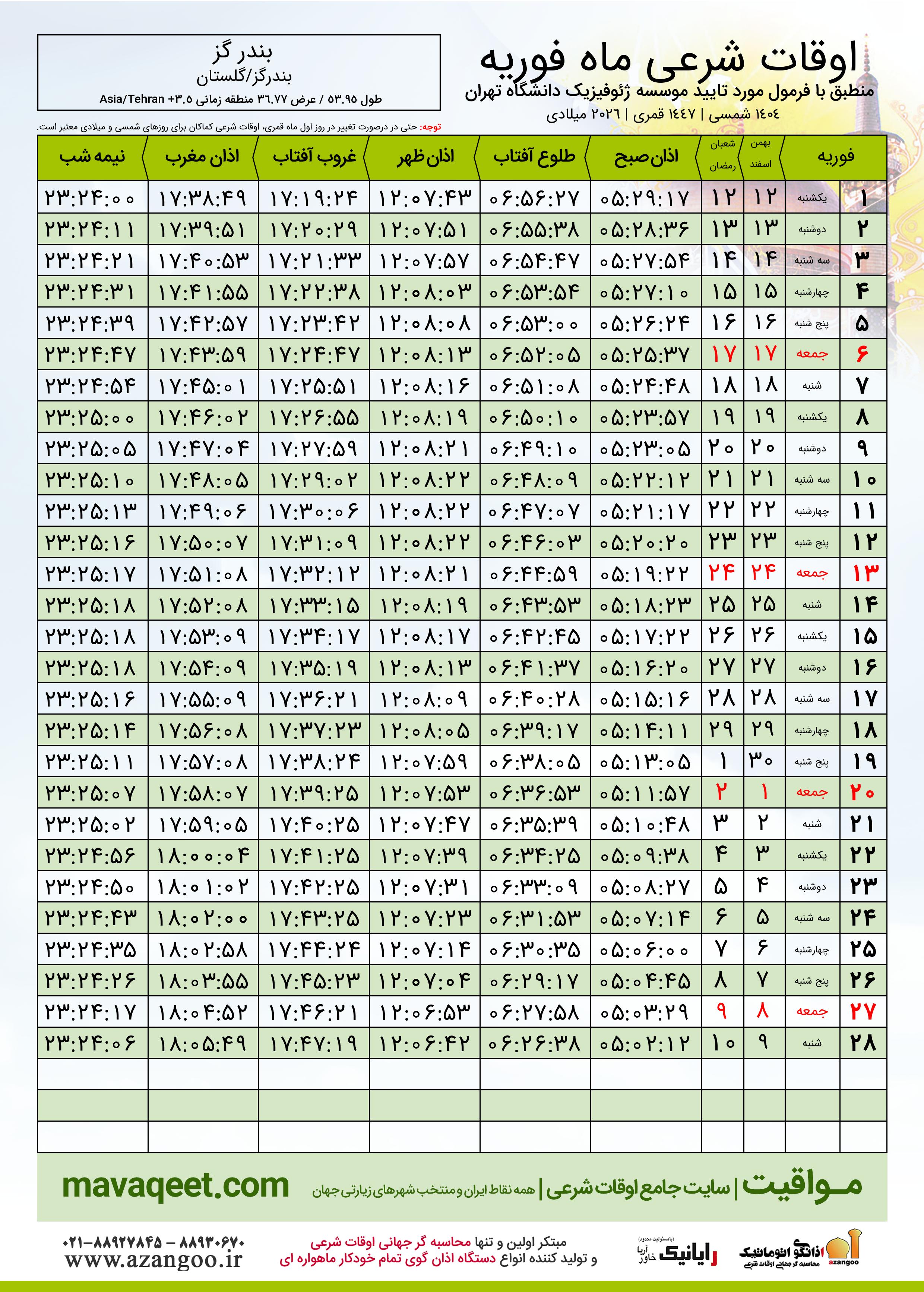 اوقات شرعی فوریه ٢٠٢٦ شهر بندر گز + دانلود
