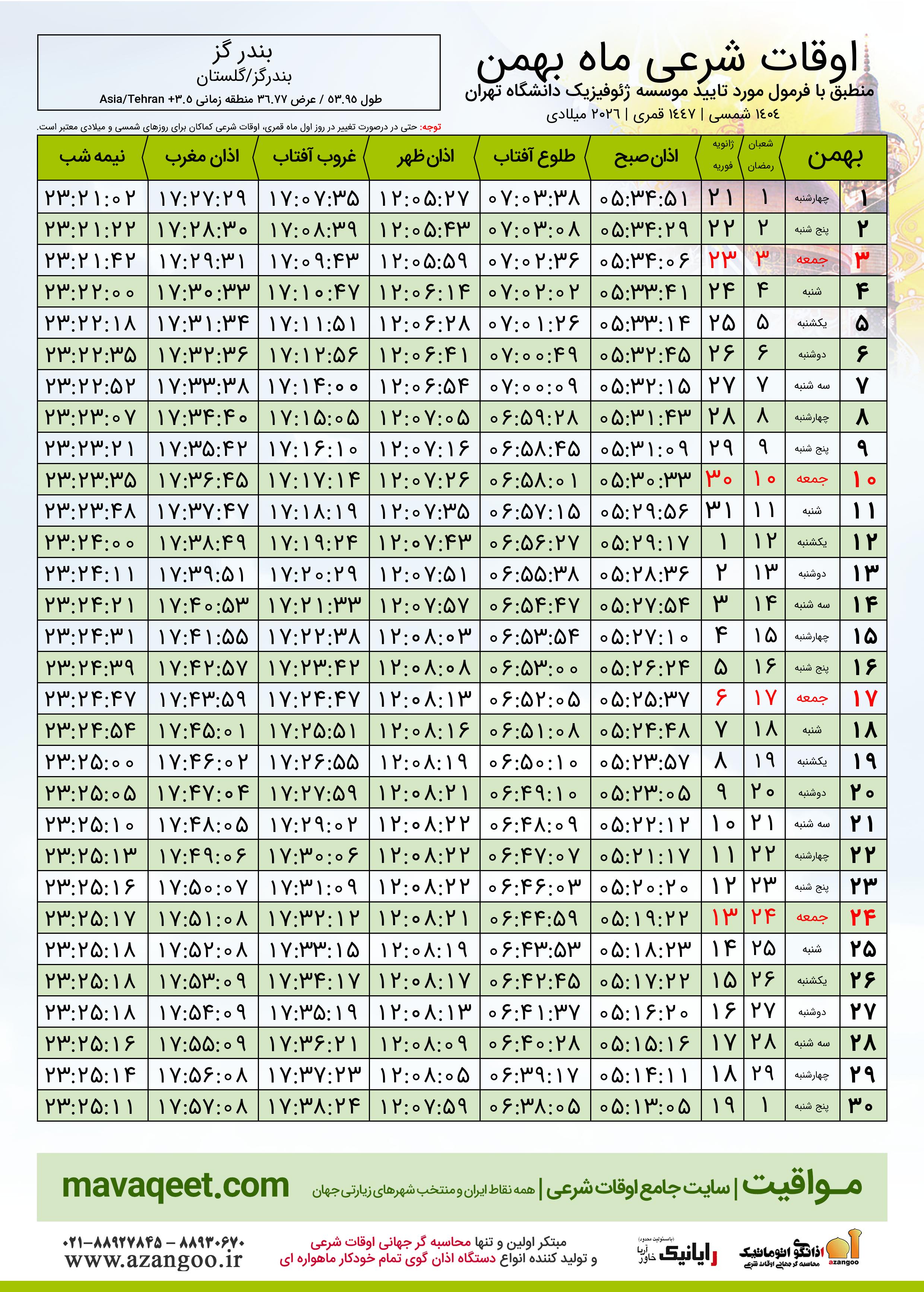 دانلود اوقات شرعی بهمن ٠٤ - ١٤٠٤ شهر بندر گز