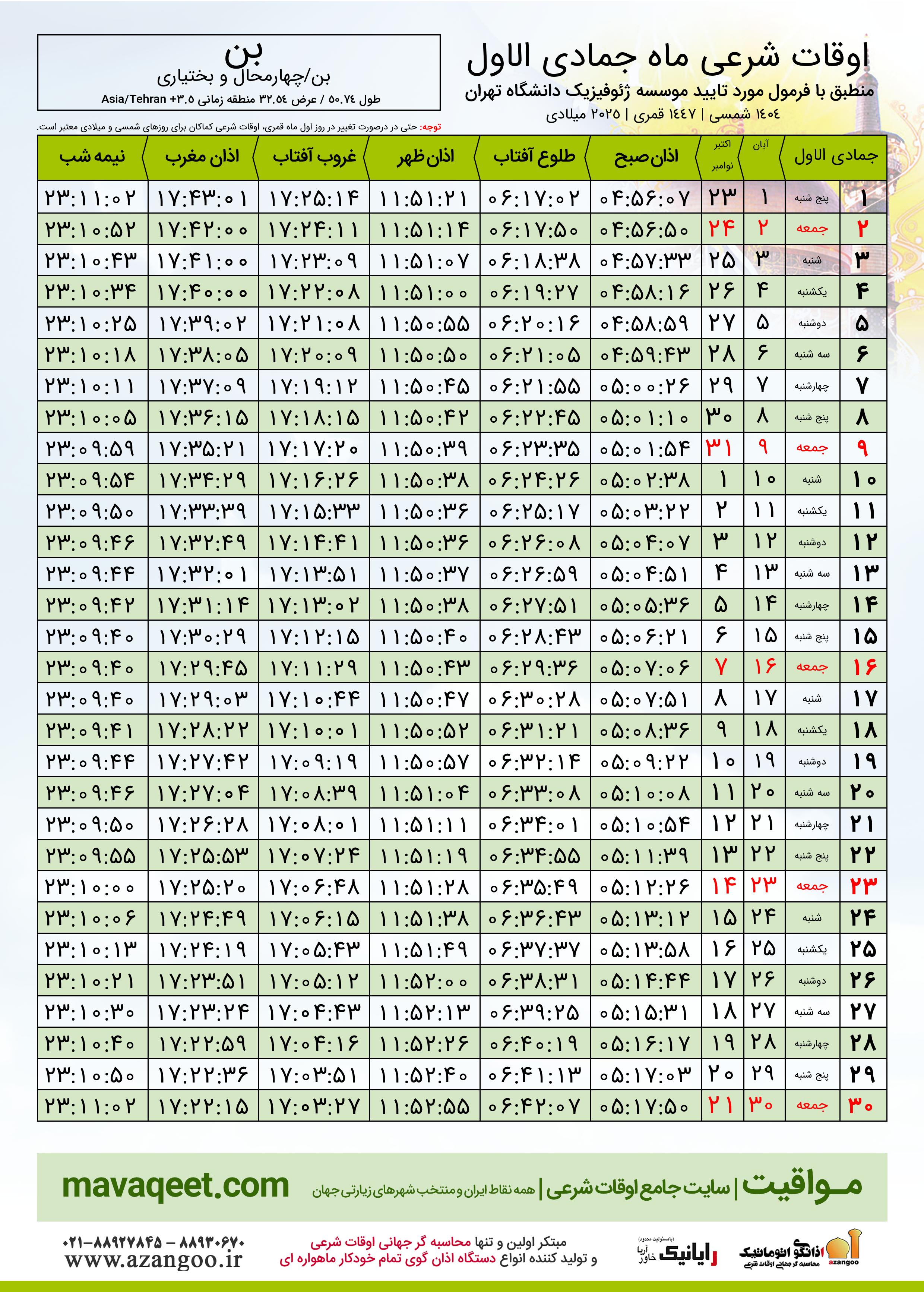 جدول اوقات شرعی جمادی الاول ١٤٤٧ قمری شهر بن