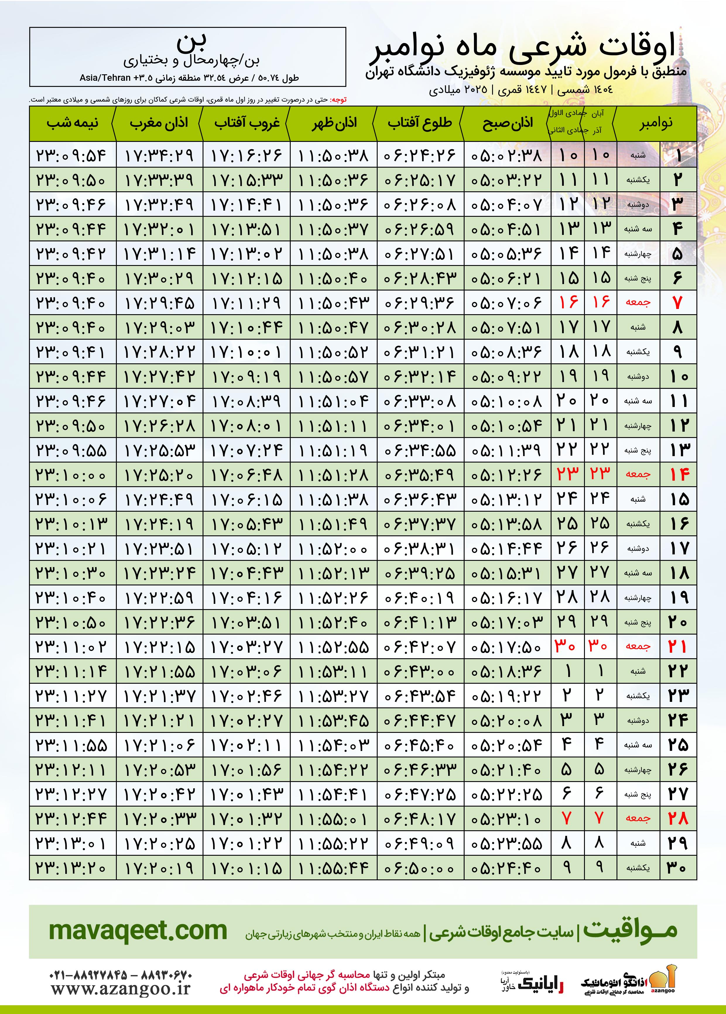 دانلود اوقات شرعی ماه رمضان ٠٤ - ١٤٠٤ شمسی | ٢٠٢٦ میلادی | ١٤٤٧ قمری شهر بن