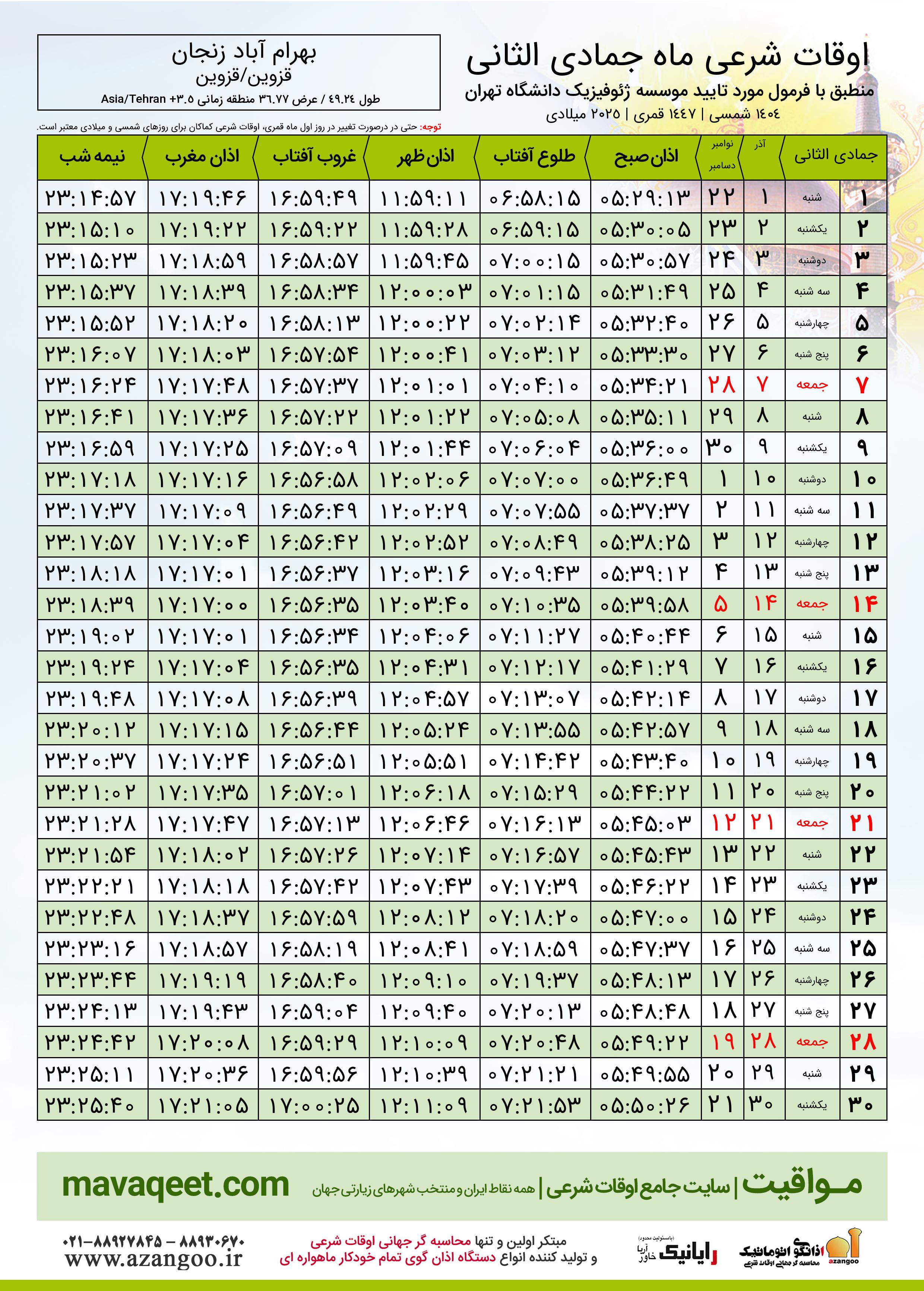 اوقات شرعی ماه جمادی الثانی ١٤٤٧ هـ.ق شهر بهرام آباد زنجان بر