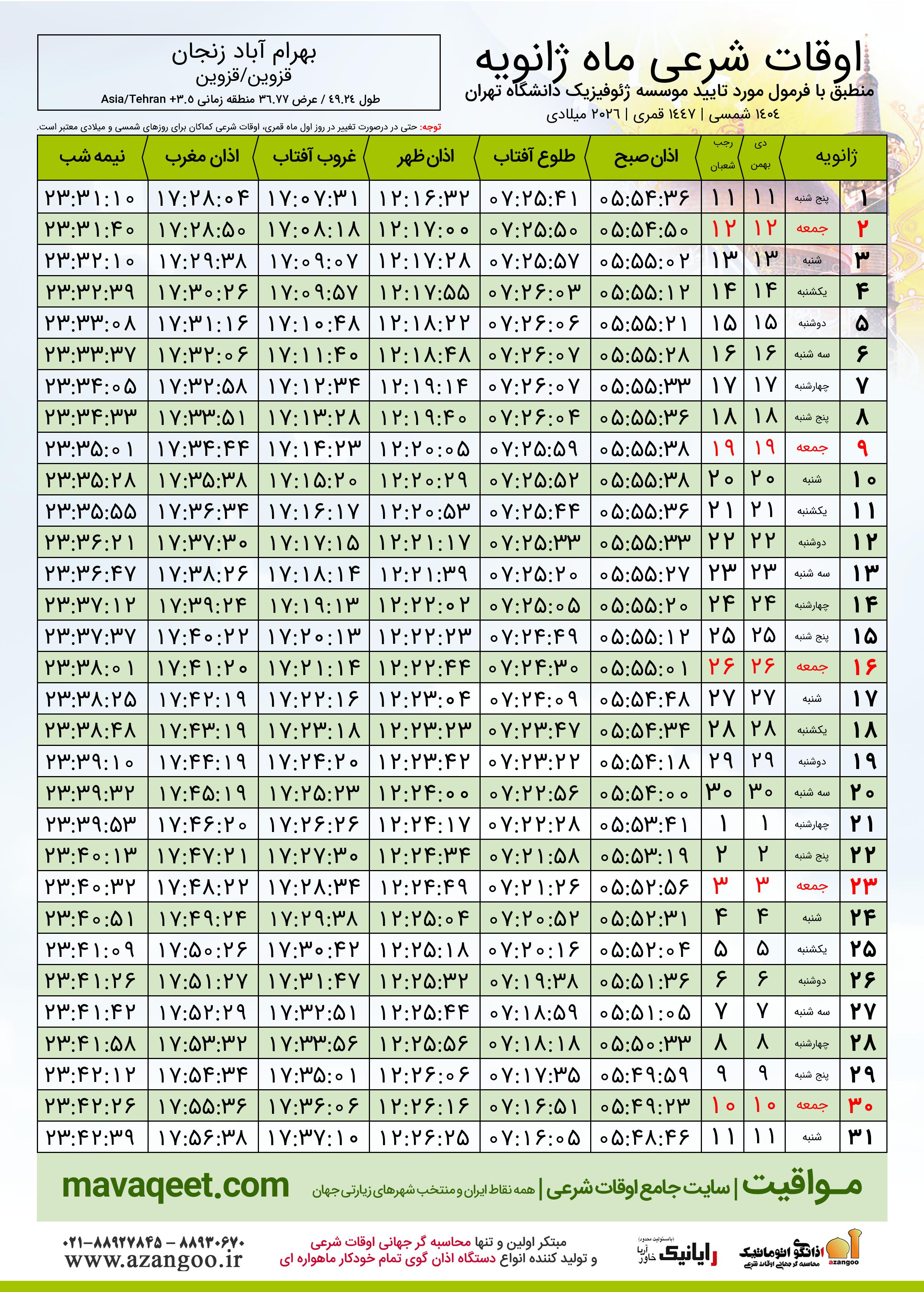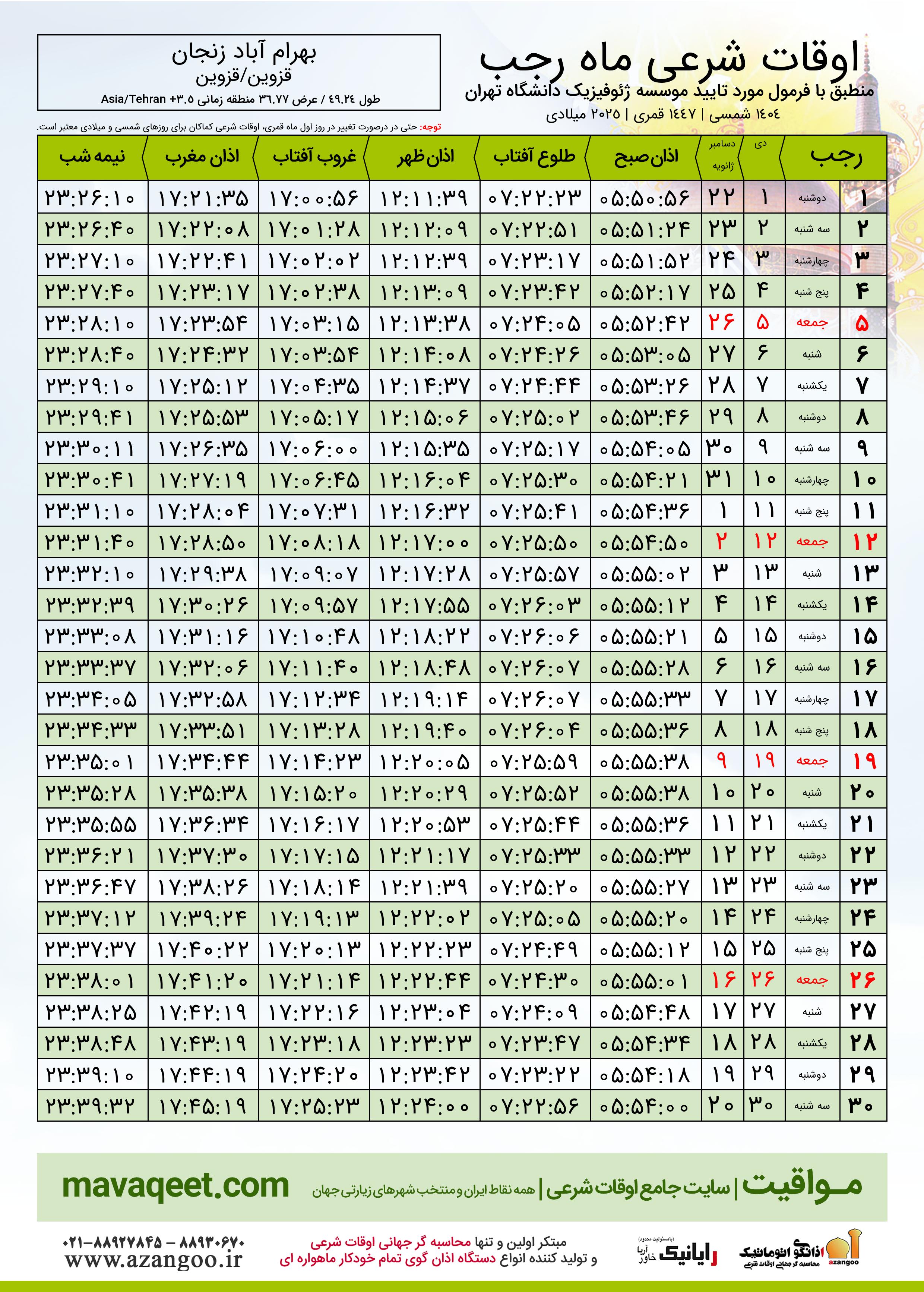 اوقات شرعی ماه رجب ١٤٤٧ هـ.ق شهر بهرام آباد زنجان بر
