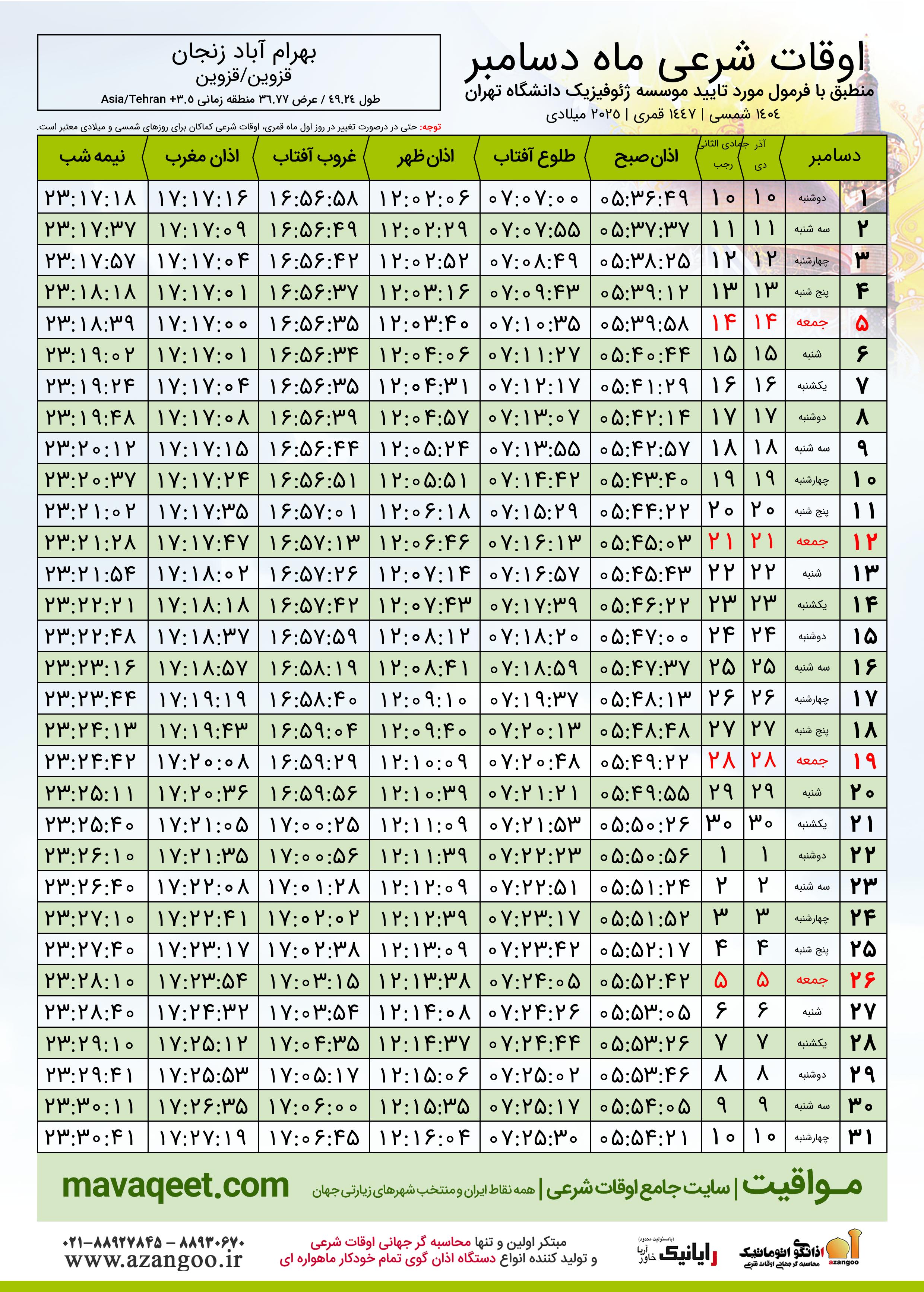 جدول اوقات شرعی دسامبر ٢٠٢٥ میلادی شهر بهرام آباد زنجان