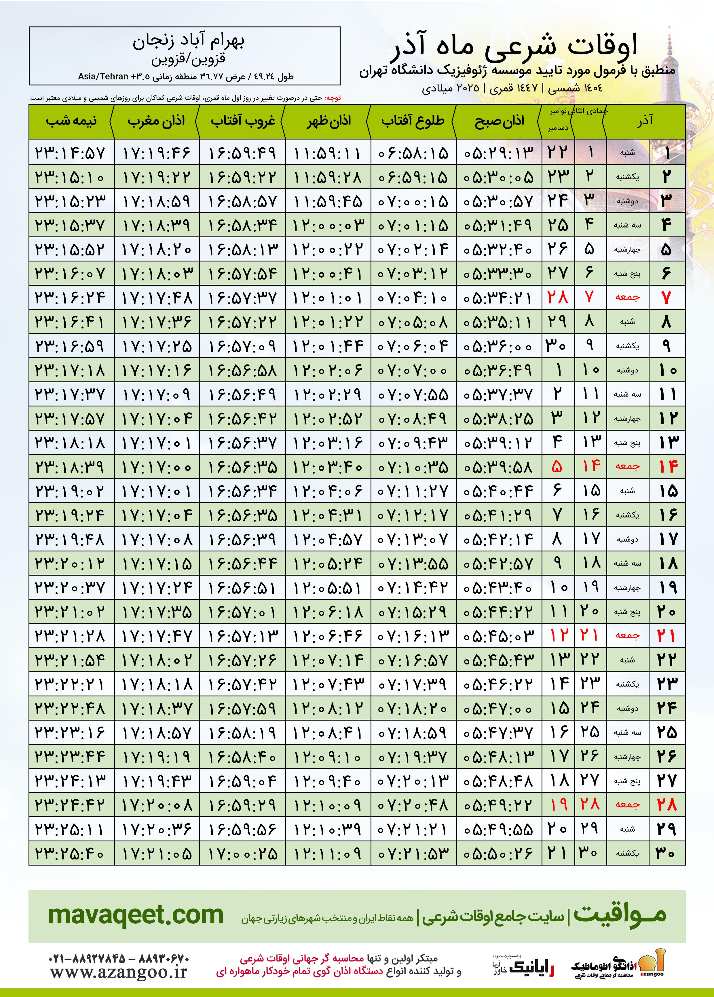 جدول اوقات شرعی آذر ١٤٠٤ شمسی شهر بهرام آباد زنجان