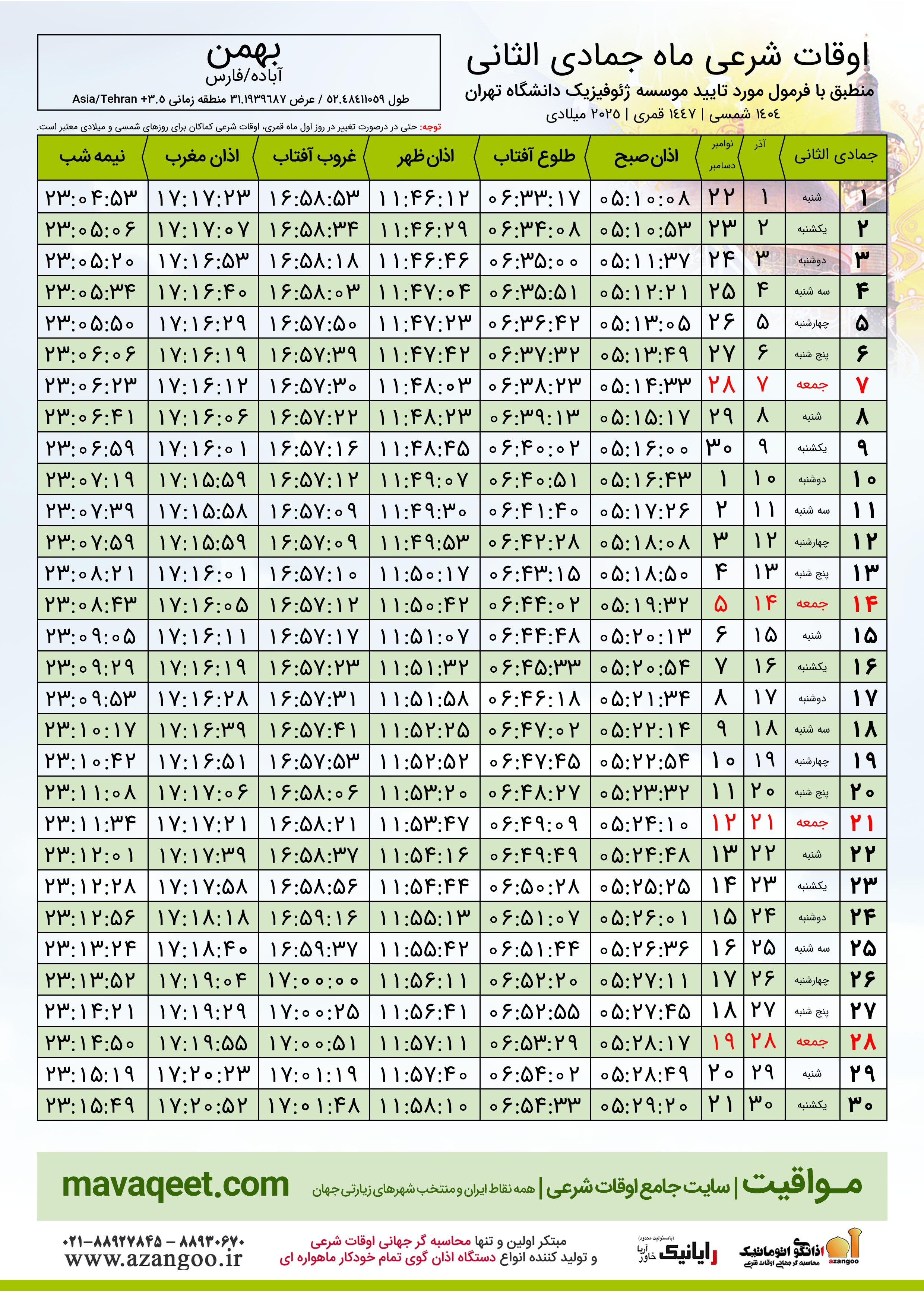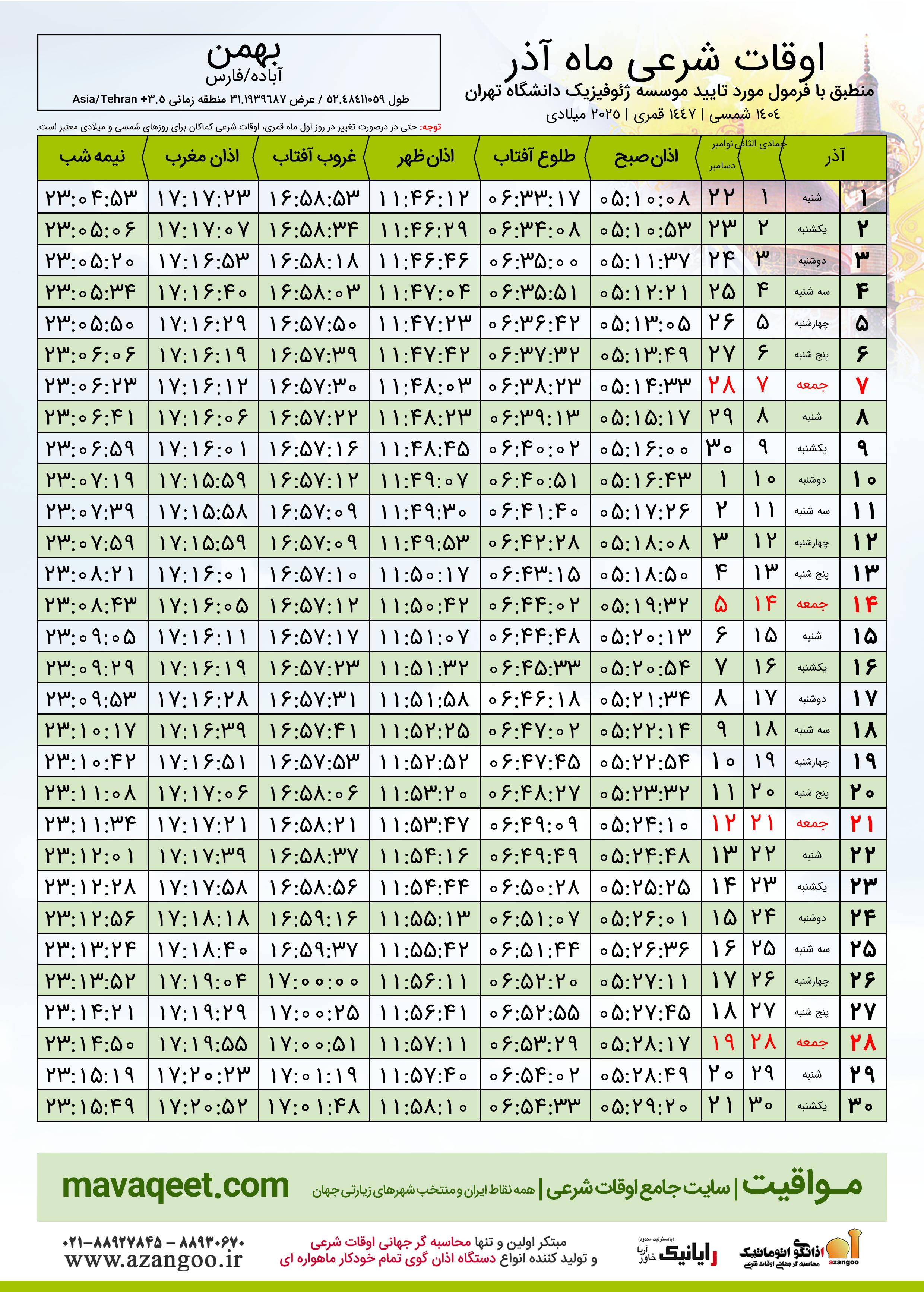 اوقات شرعی آذر ١٤٠٤ شمسی شهر بهمن