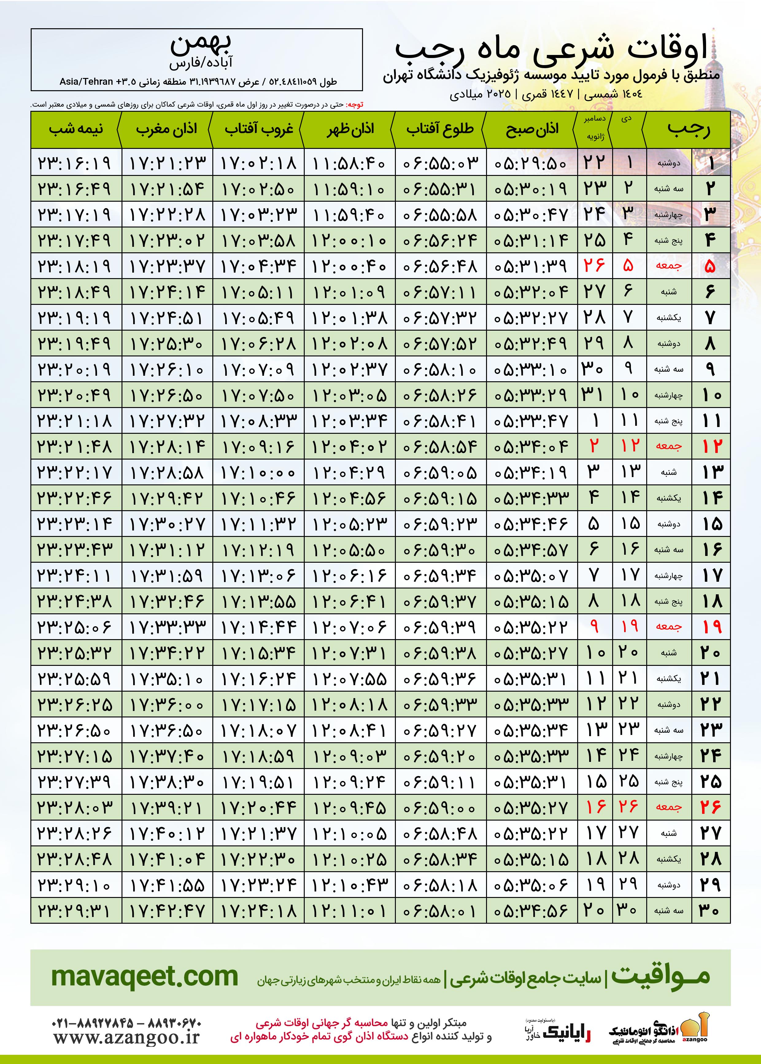 اوقات شرعی ماه رجب ١٤٤٧ هـ.ق شهر بهمن بر