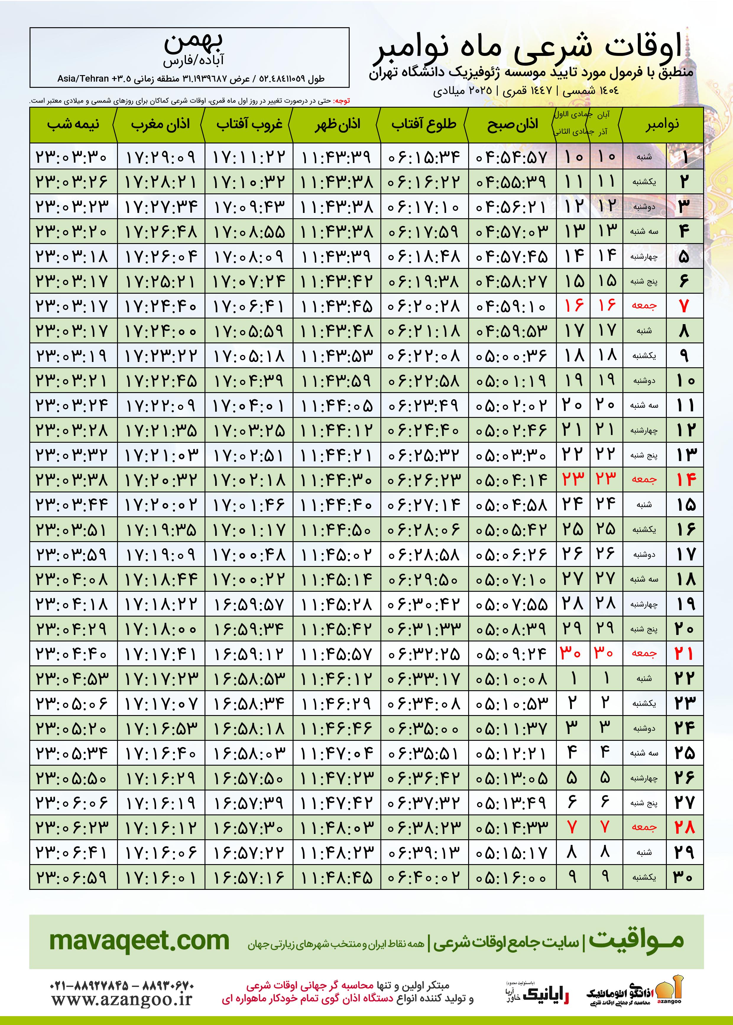 جدول اوقات شرعی نوامبر ٢٠٢٥ میلادی شهر بهمن