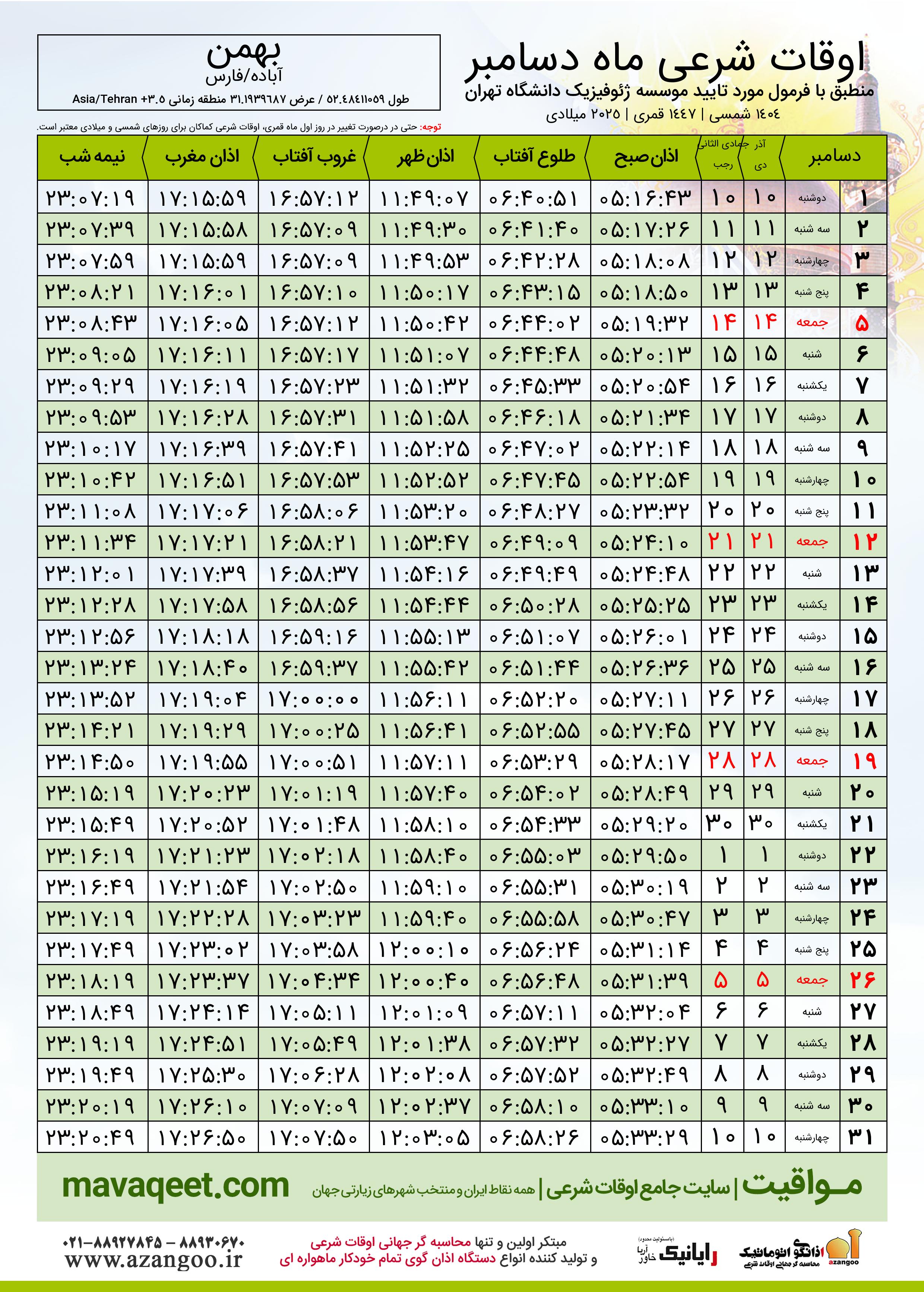 اوقات شرعی دسامبر ٢٠٢٥ میلادی شهر بهمن