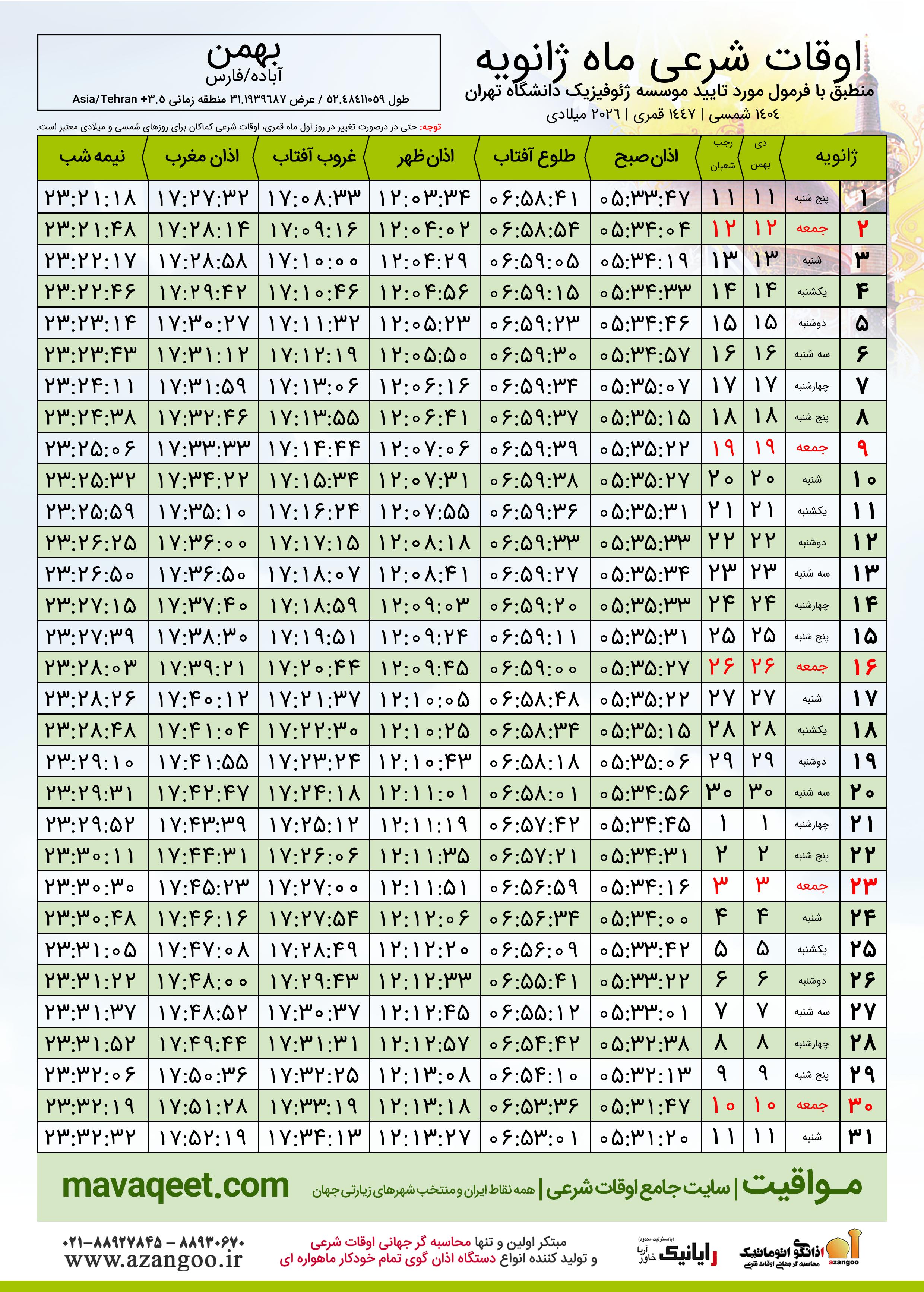 دانلود اوقات شرعی ژانویه ٢٠٢٦ شهر بهمن