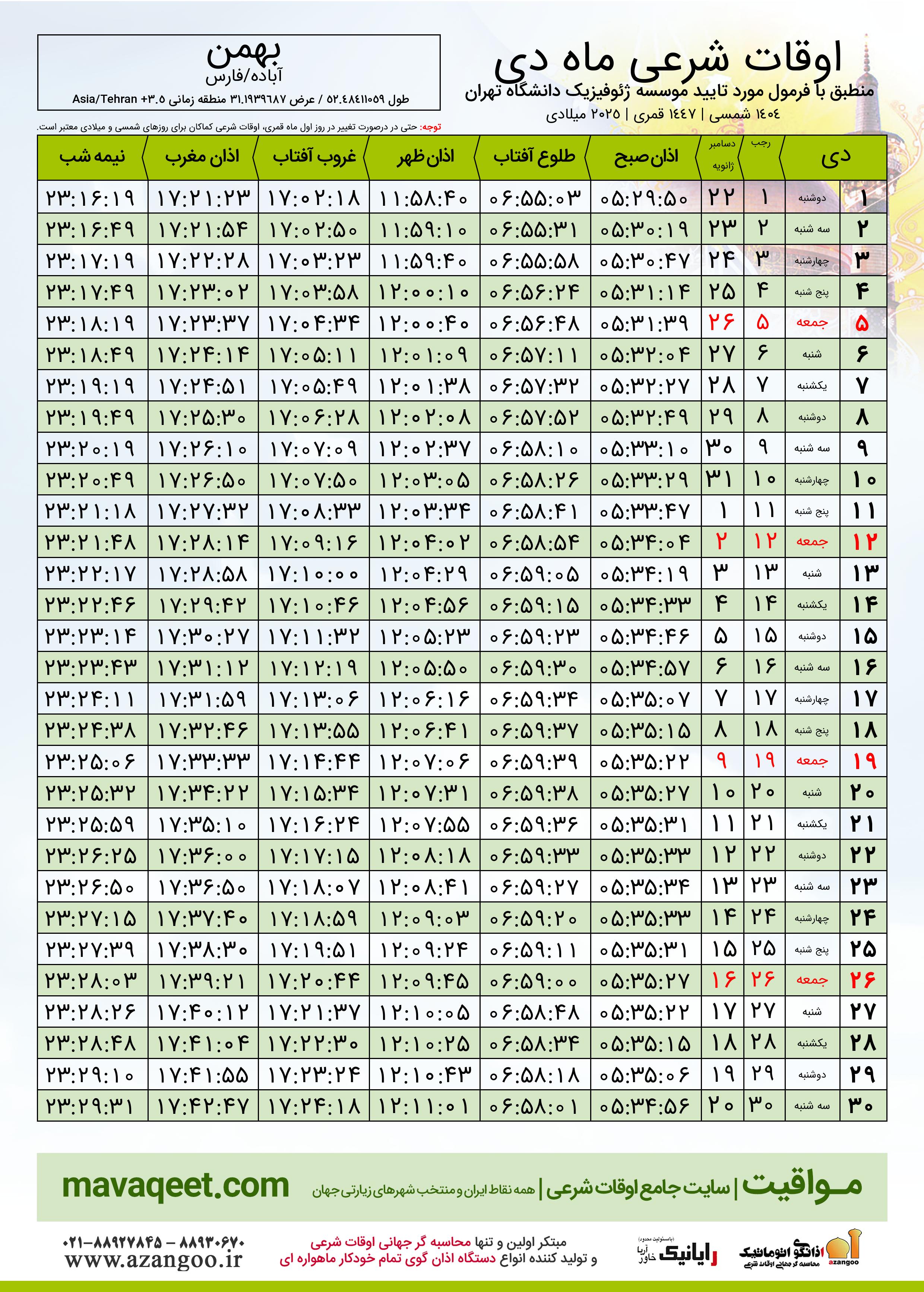اوقات شرعی دی ١٤٠٤ شمسی شهر بهمن