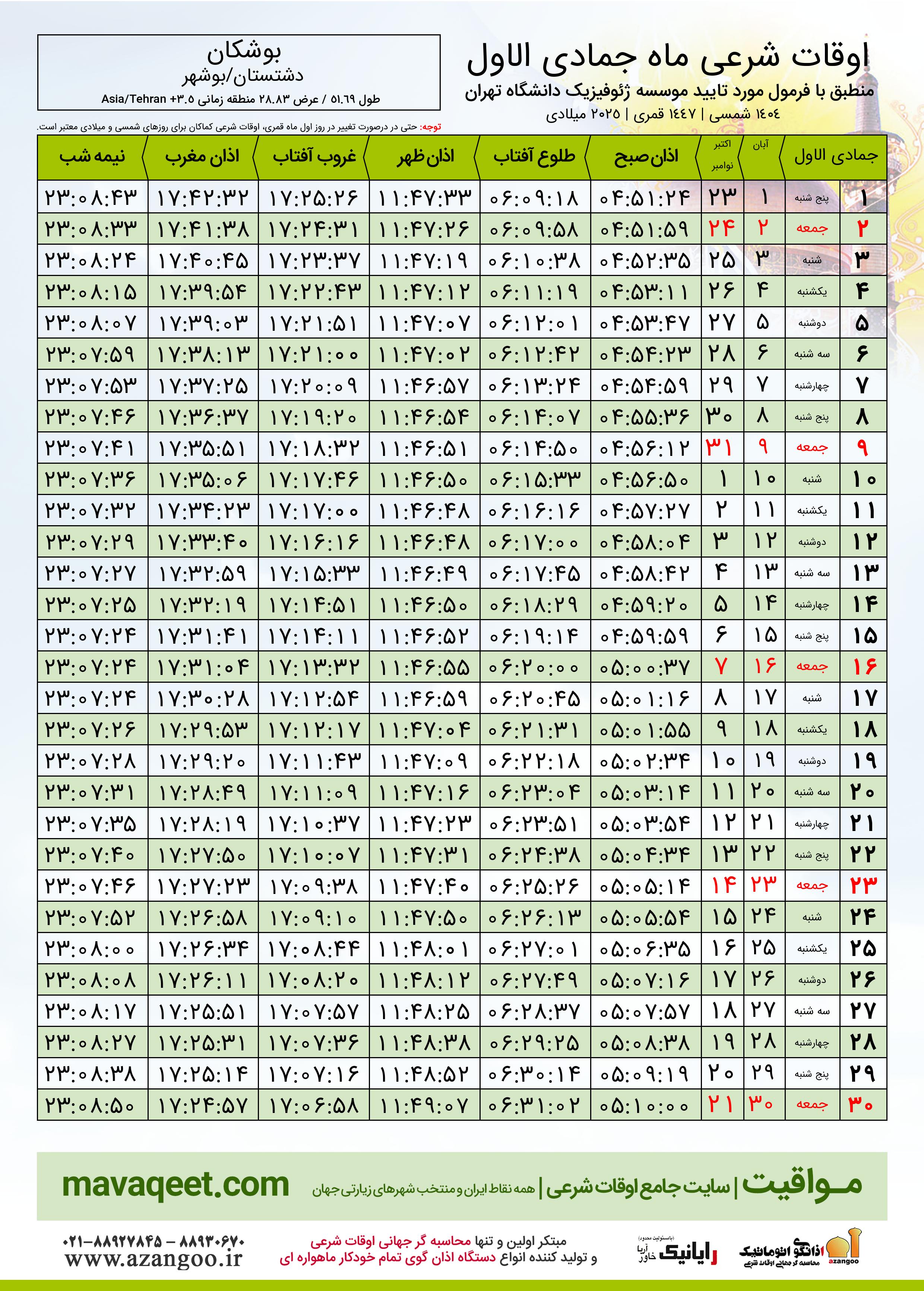 اوقات شرعی ماه جمادی الاول ١٤٤٧ هـ.ق شهر بوشکان بر