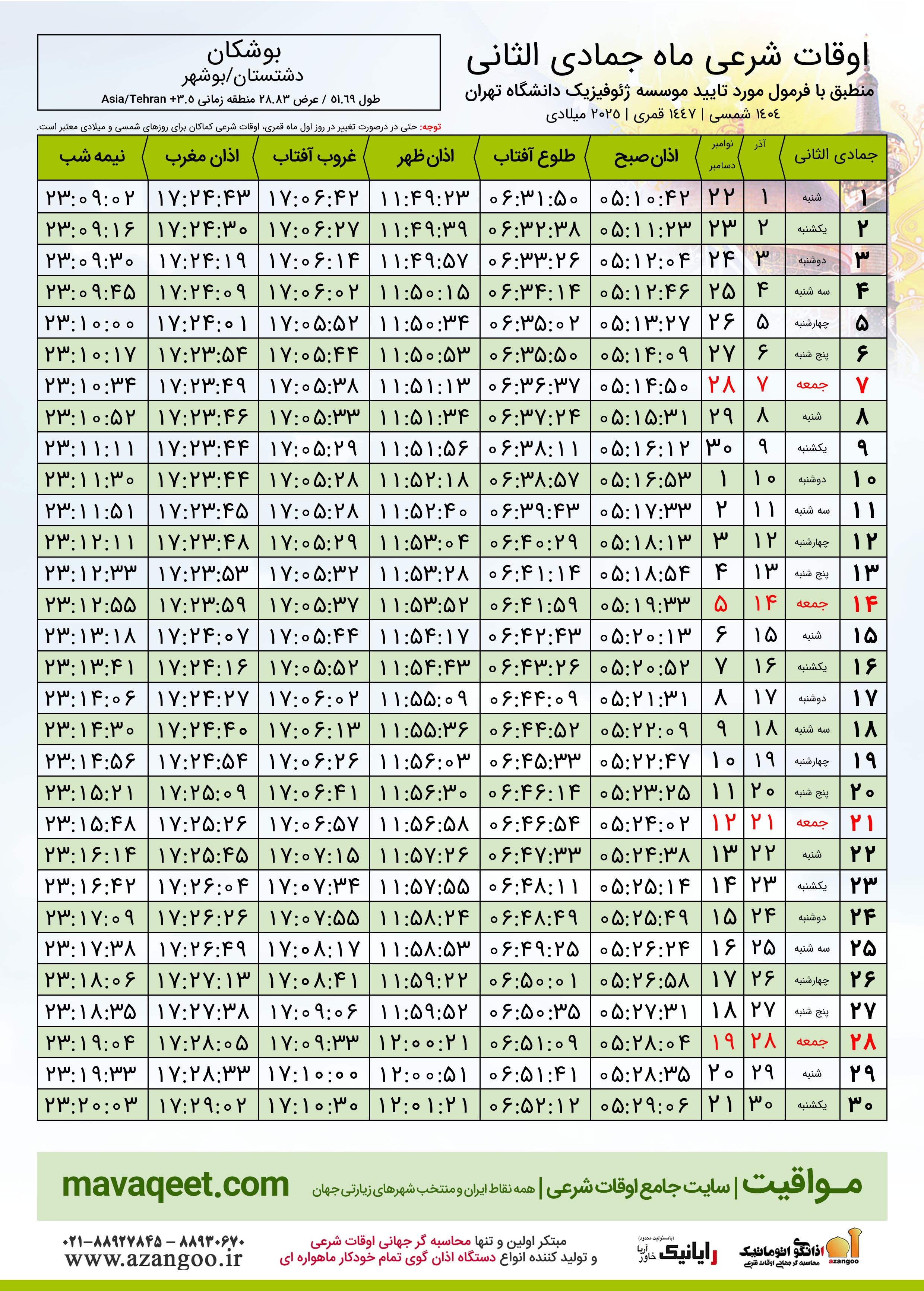 اوقات شرعی ماه جمادی الثانی ١٤٤٧ هـ.ق شهر بوشکان بر