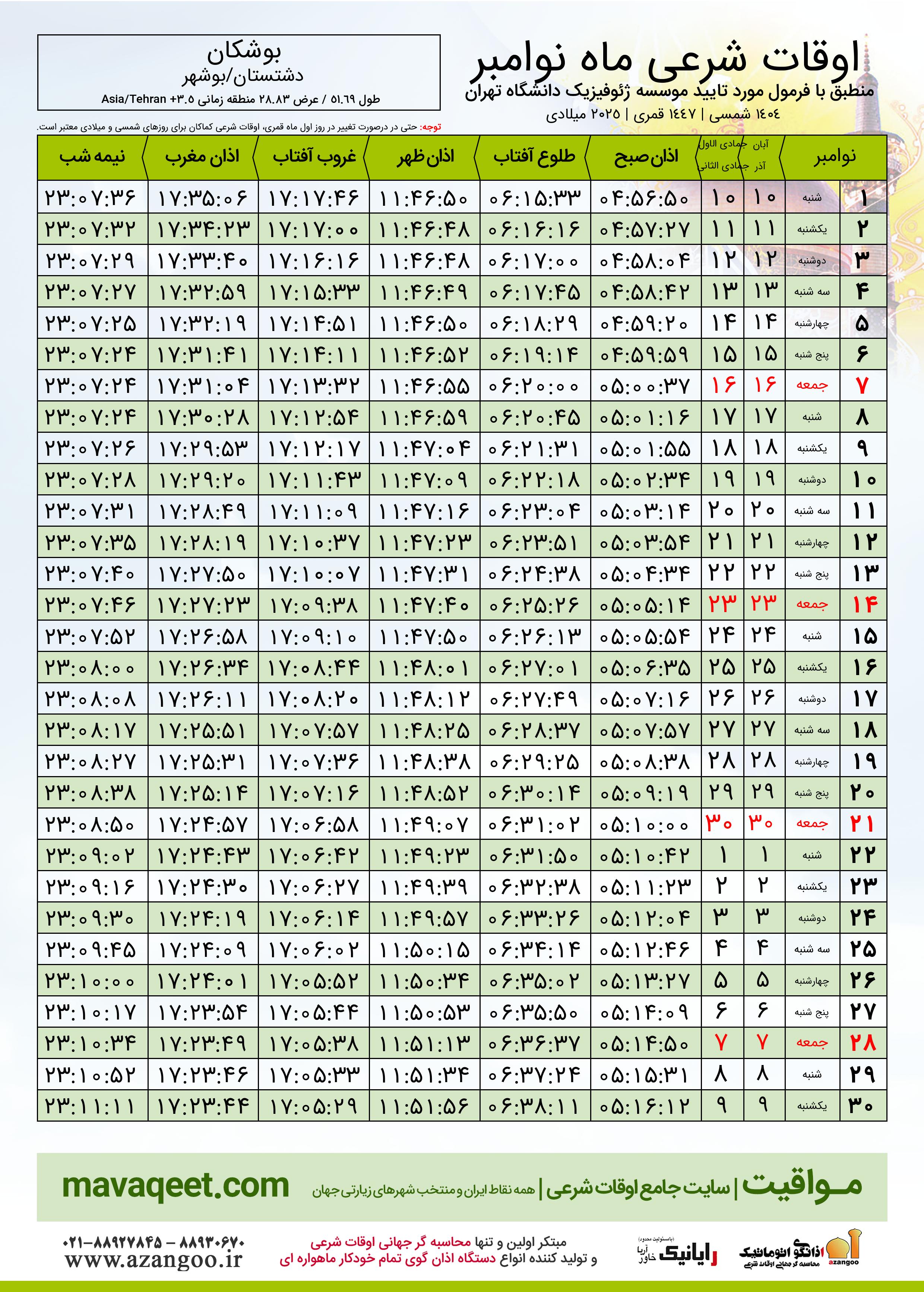 جدول اوقات شرعی نوامبر ٢٠٢٥ میلادی شهر بوشکان