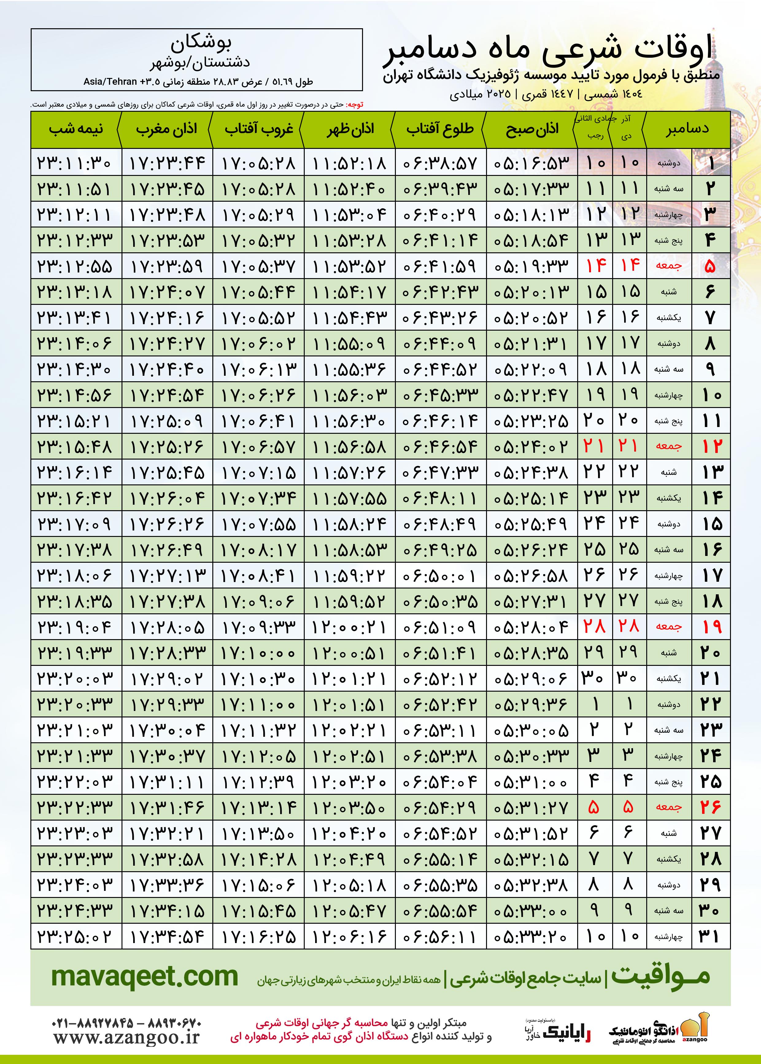 جدول اوقات شرعی دسامبر ٢٠٢٥ میلادی شهر بوشکان