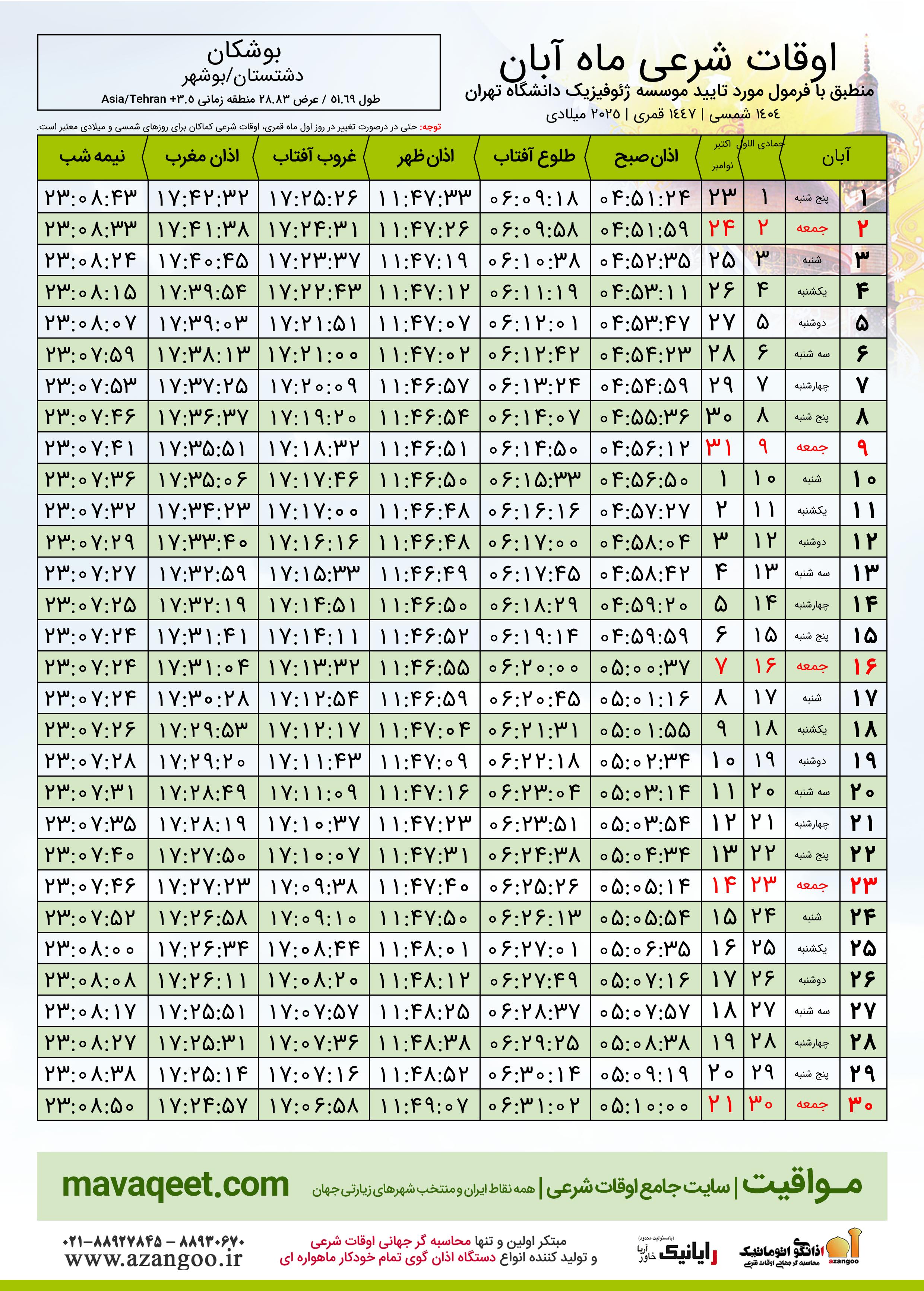 جدول اوقات شرعی آبان ١٤٠٤ شمسی شهر بوشکان