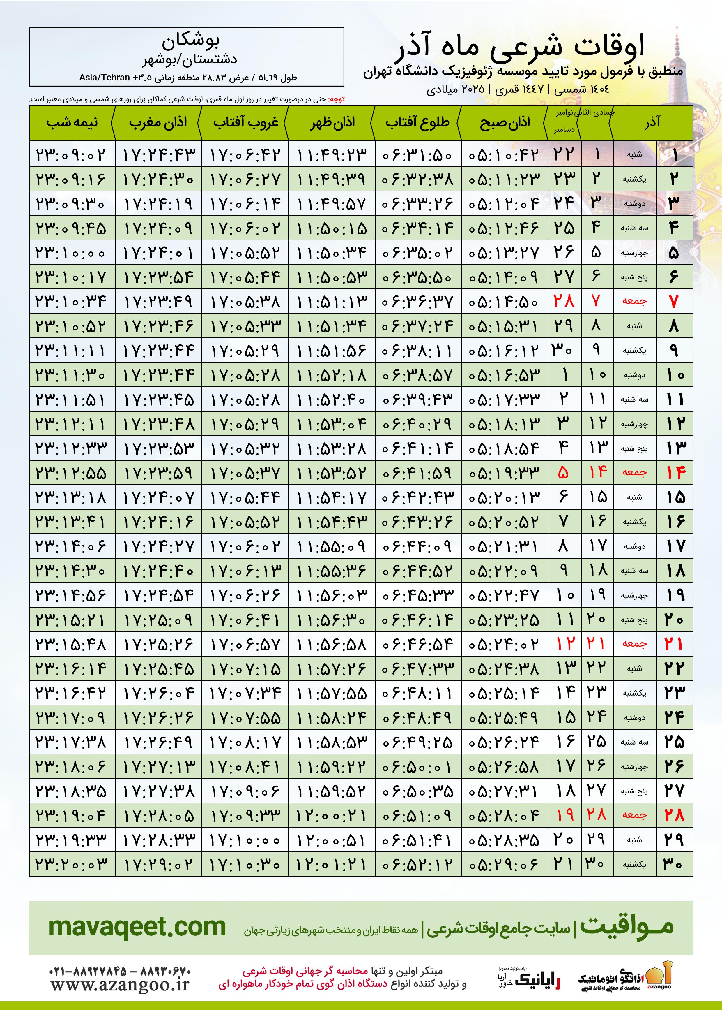 جدول اوقات شرعی آذر ١٤٠٤ شمسی شهر بوشکان