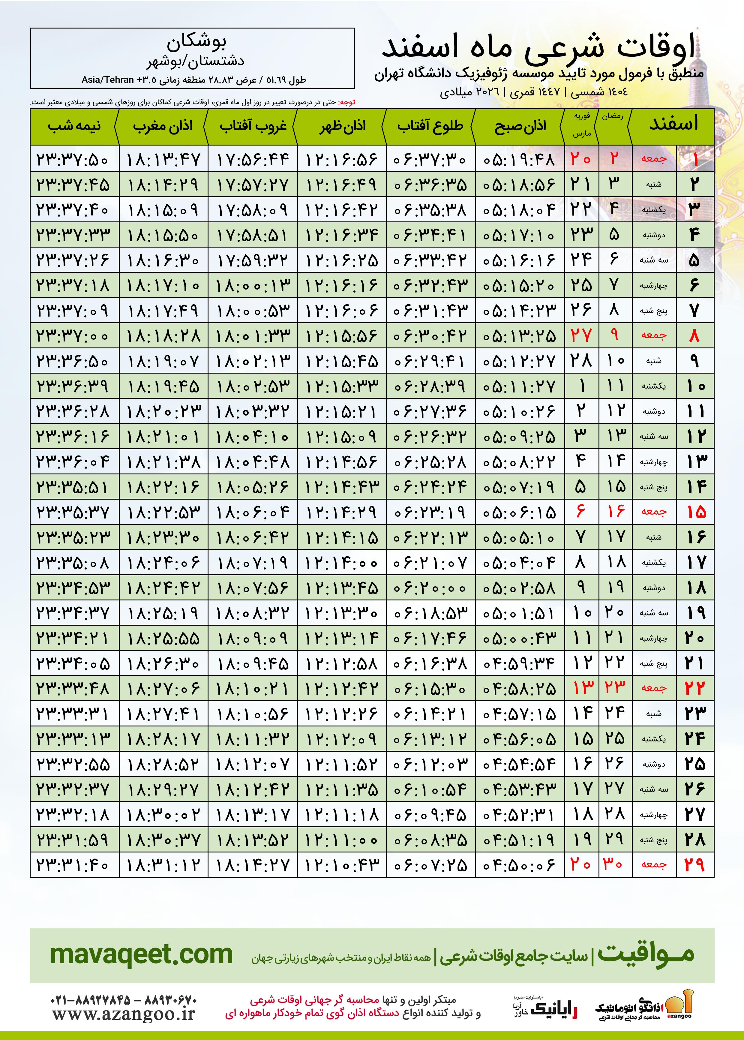 اوقات شرعی ماه رمضان شهر بوشکان ١٤٠٤ - ٠٤ شمسی | ٢٠٢٦ میلادی