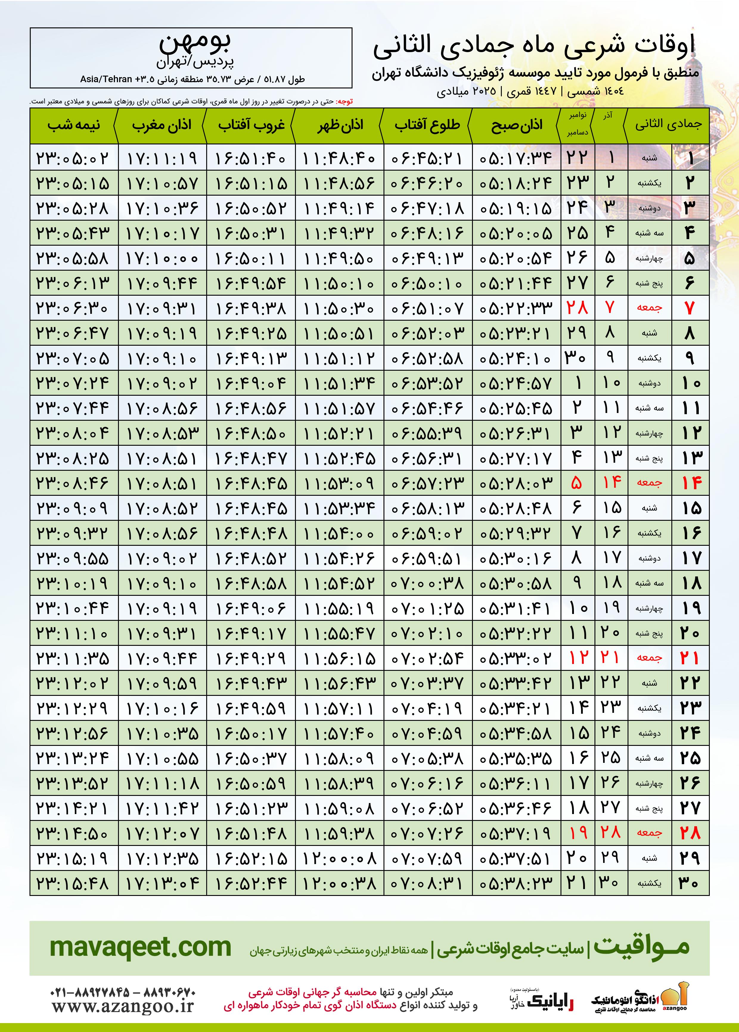 اوقات شرعی ماه جمادی الثانی ١٤٤٧ هـ.ق شهر بومهن بر