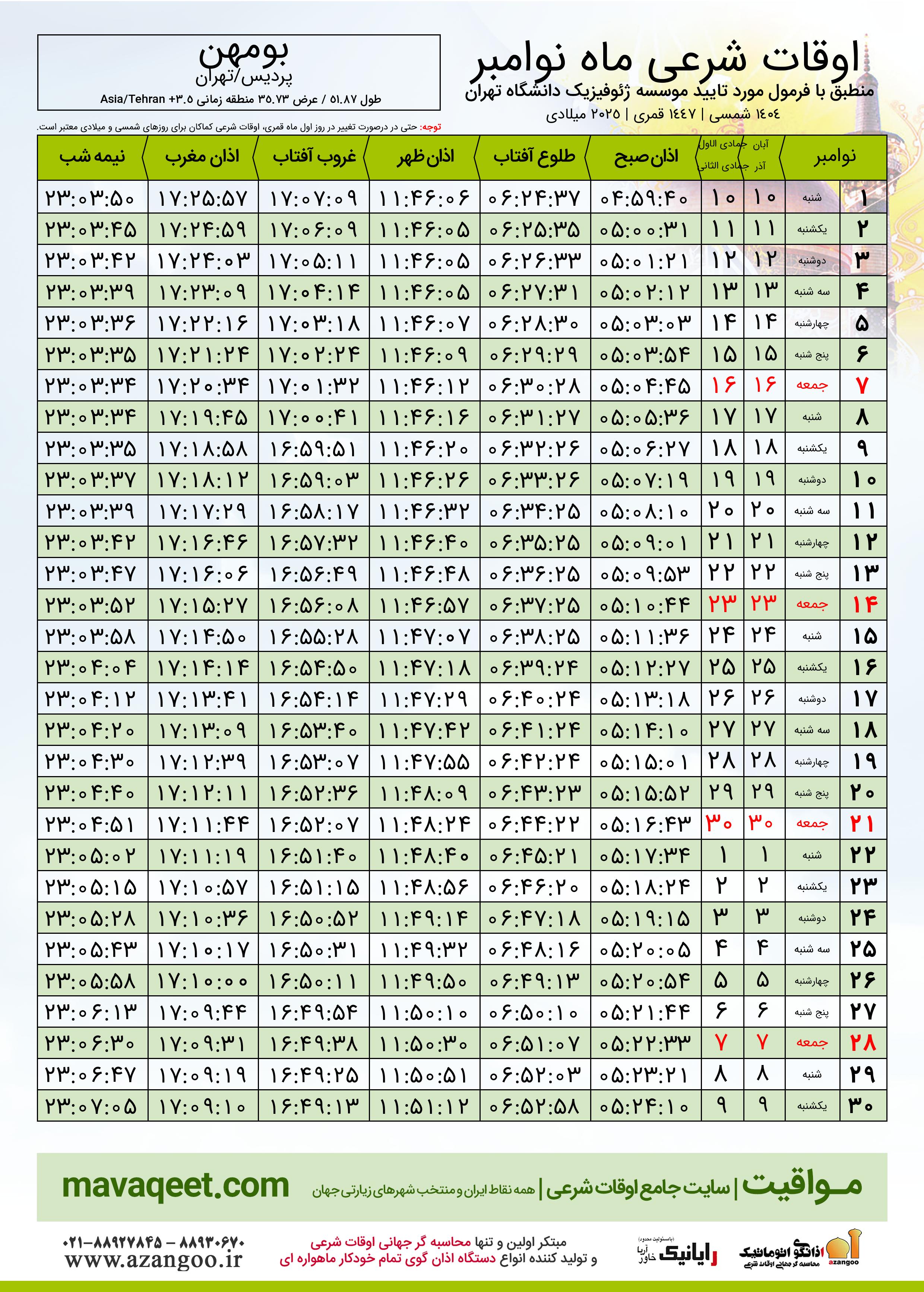 جهت نمایش تصویر جدول اوقات شرعی جدول اوقات شرعی نوامبر ٢٠٢٥ میلادی شهر بومهن شهر بومهن در اندازه