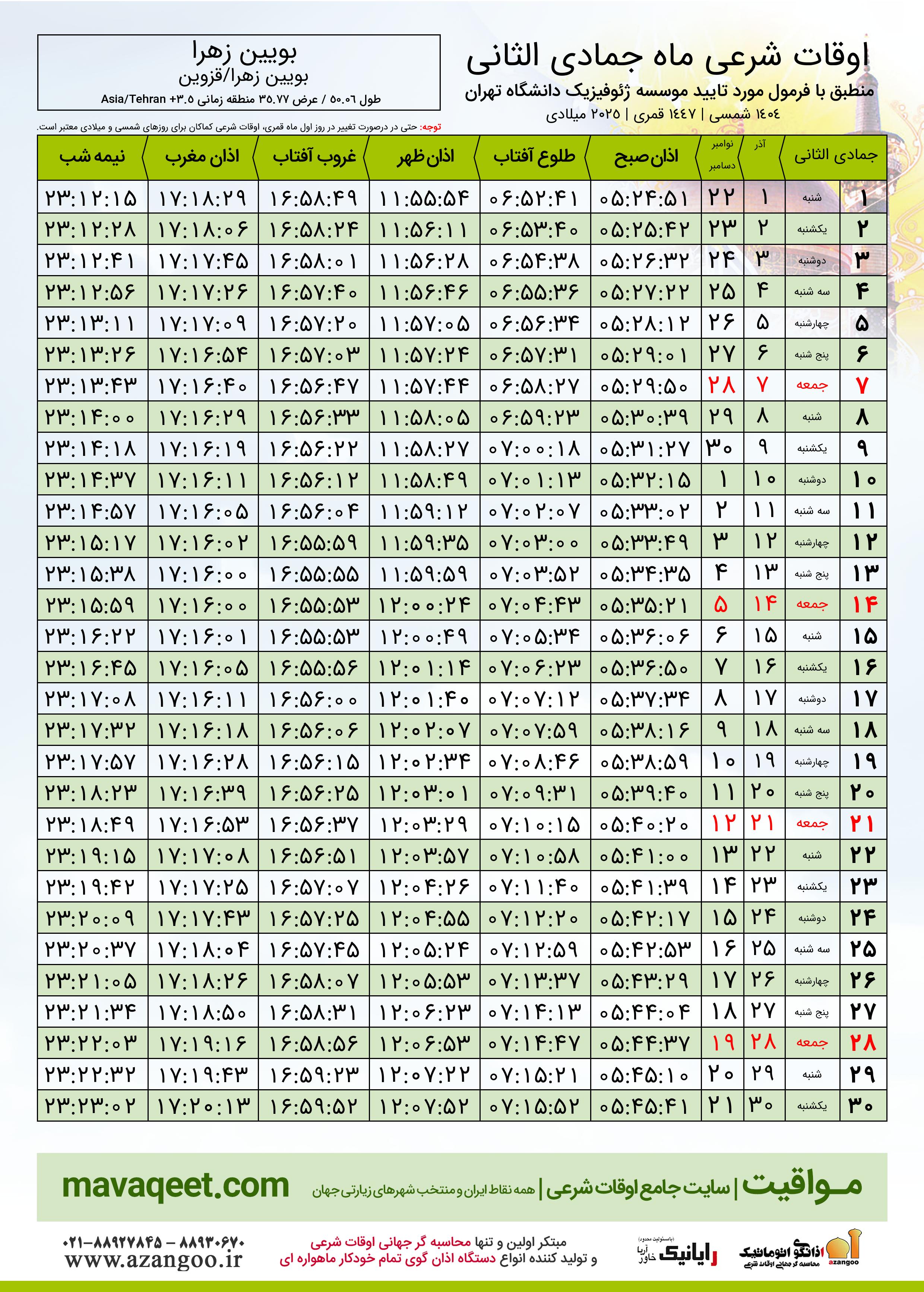 اوقات شرعی ماه جمادی الثانی ١٤٤٧ هـ.ق شهر بویین زهرا بر