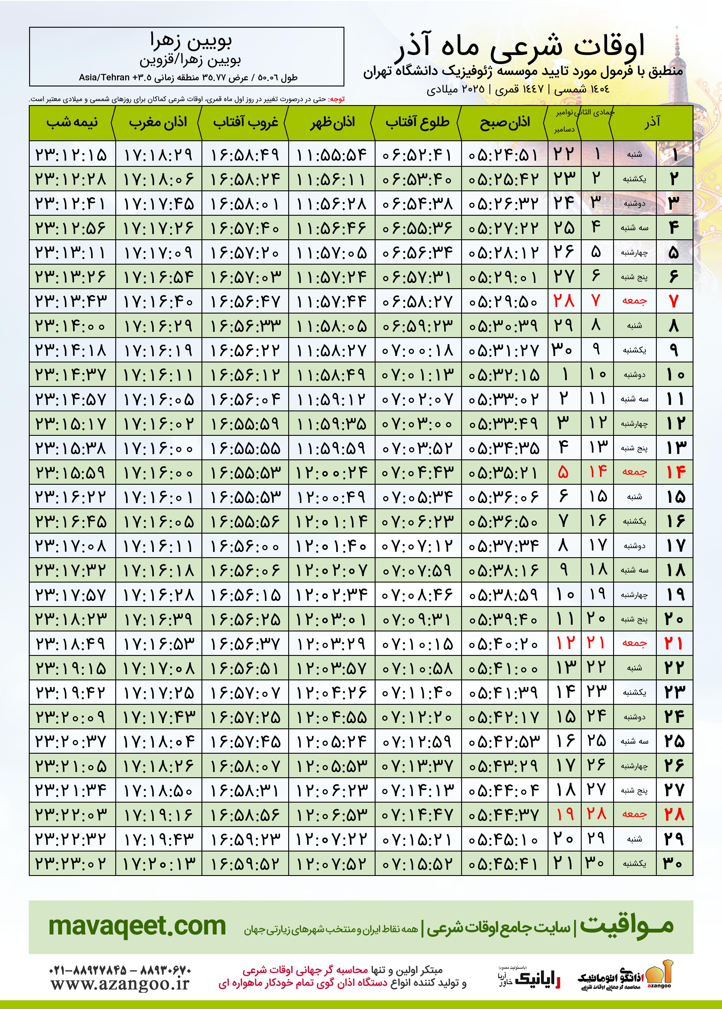 اوقات شرعی آذر ١٤٠٤ شمسی شهر بویین زهرا