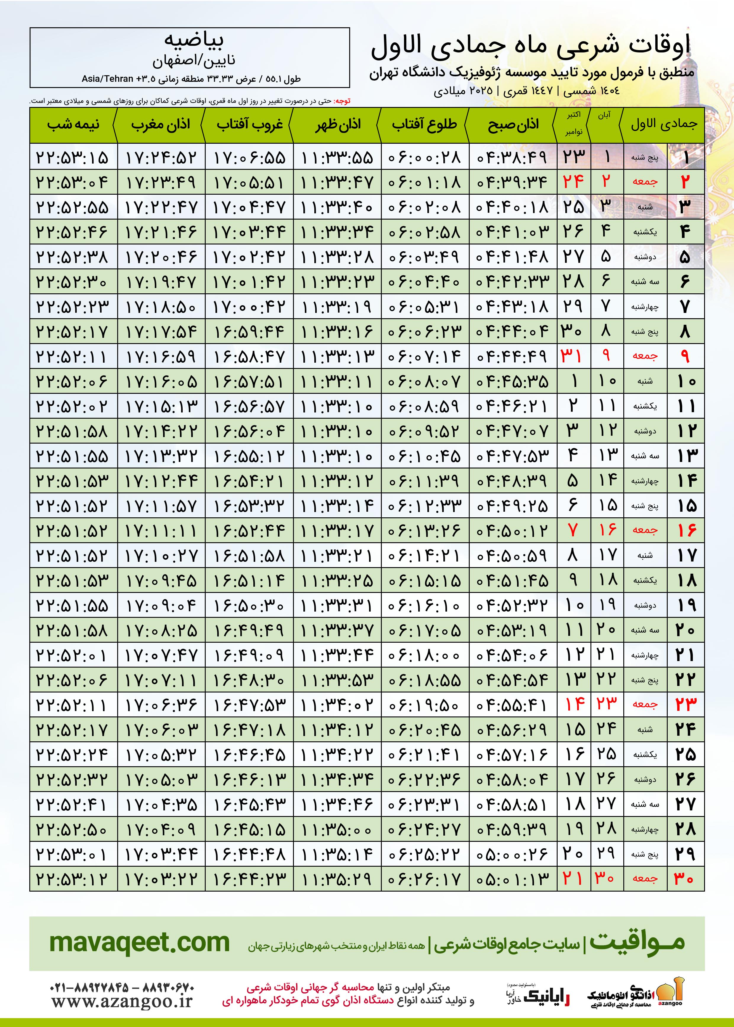 جدول اوقات شرعی جمادی الاول ١٤٤٧ قمری شهر بیاضیه