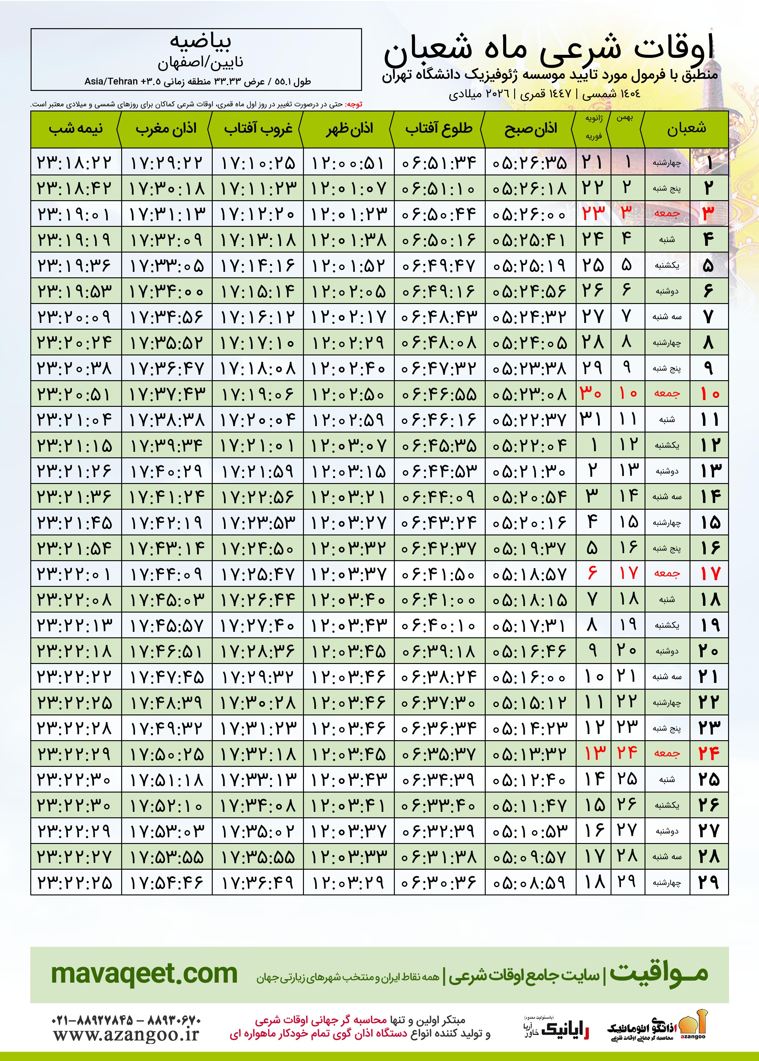 جدول اوقات شرعی شعبان ١٤٤٧ قمری شهر بیاضیه