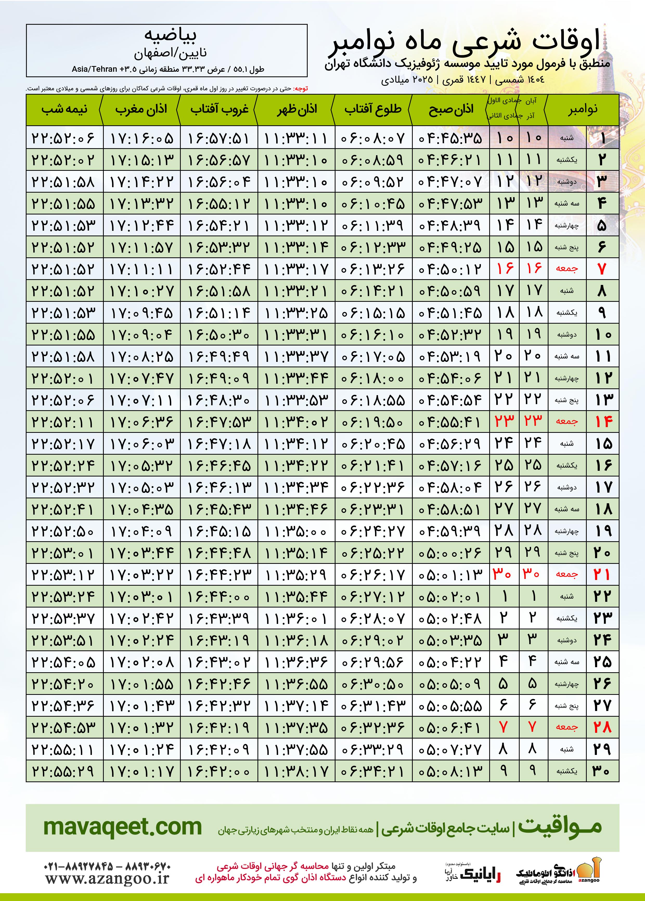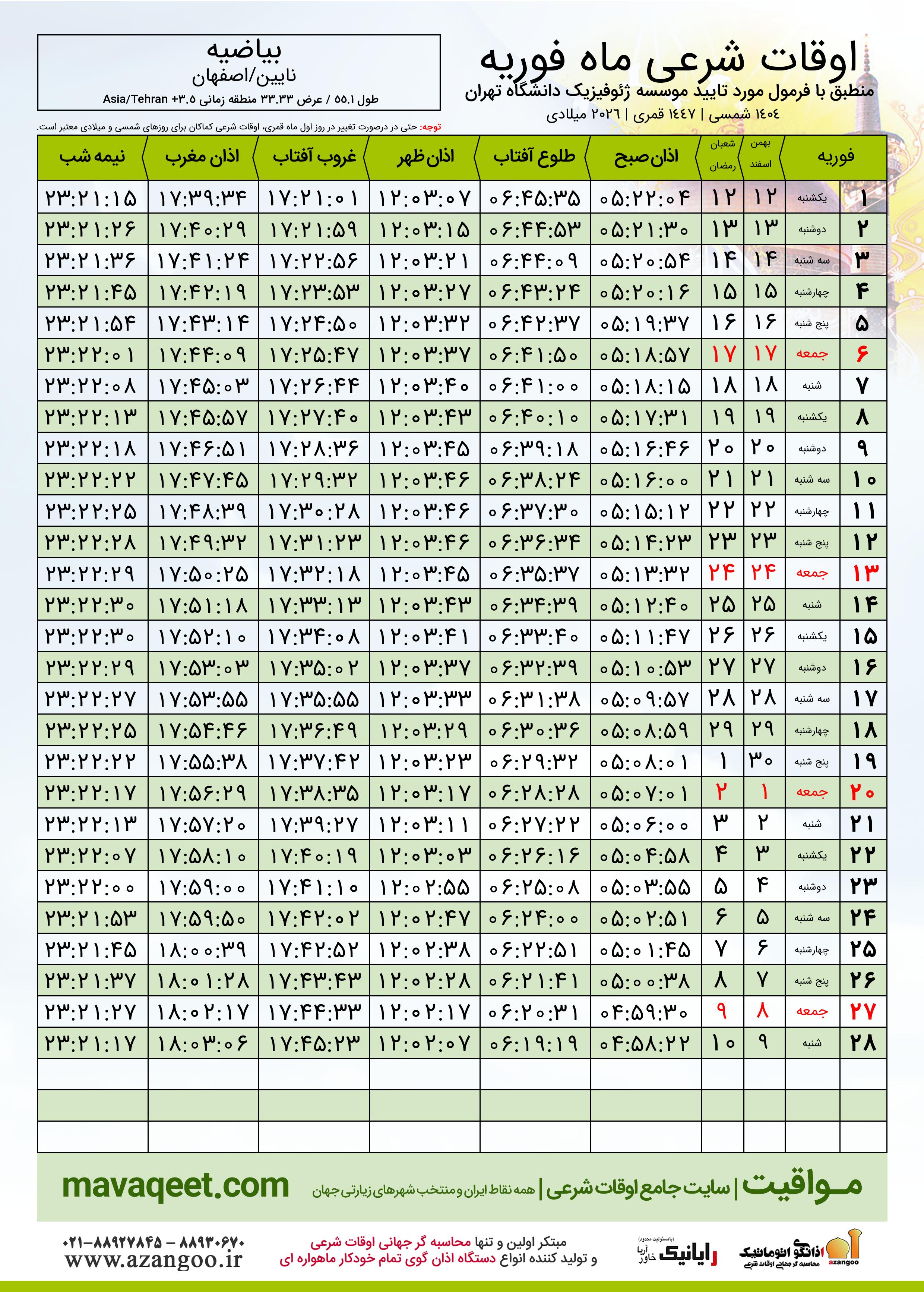 جدول اوقات شرعی ماه رمضان شهر بیاضیه ٠٤ - ١٤٠٤ شمسی | ٢٠٢٦ میلادی | ١٤٤٧ قمری