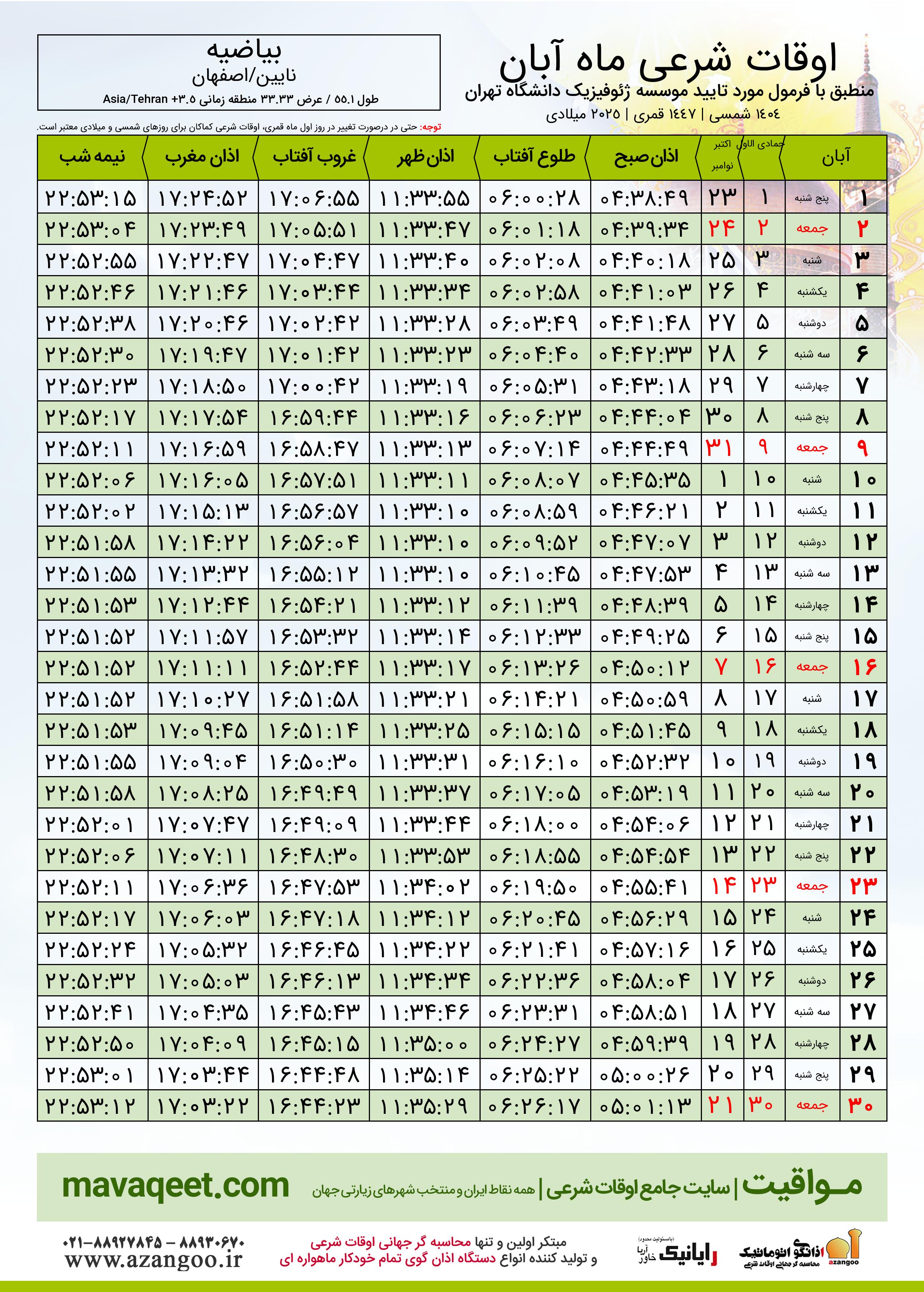 جدول اوقات شرعی آبان ١٤٠٤ شمسی شهر بیاضیه