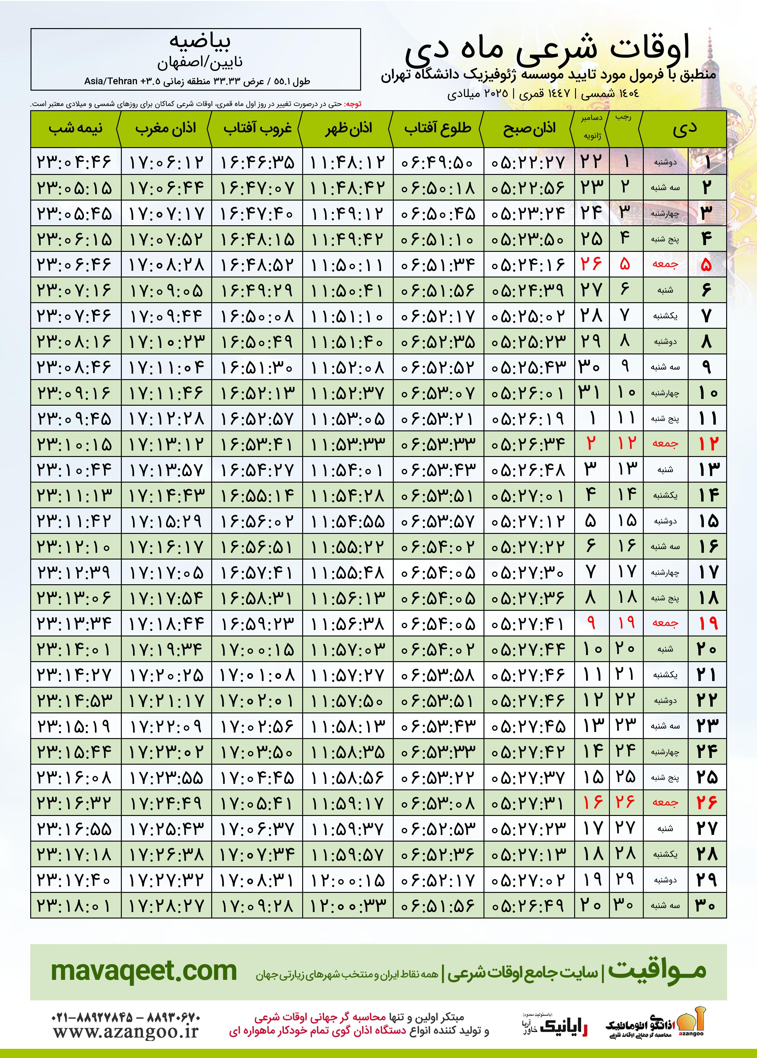 جهت نمایش تصویر جدول اوقات شرعی جدول اوقات شرعی دسامبر ٢٠٢٥ میلادی شهر بیاضیه شهر بیاضیه در اندازه