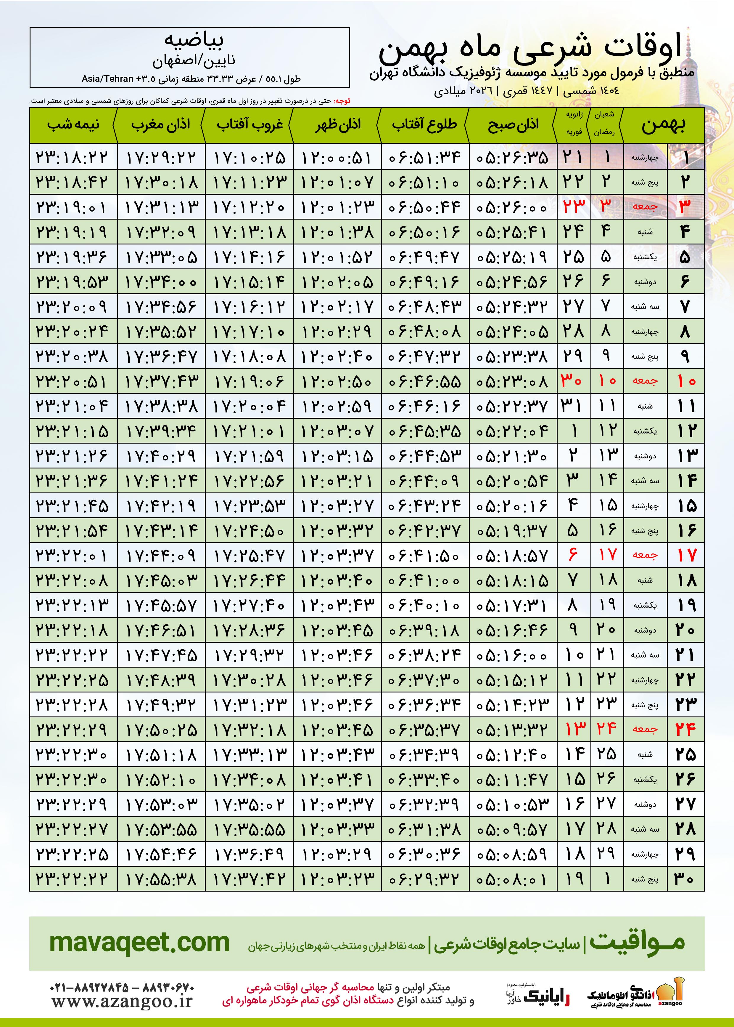 دانلود اوقات شرعی بهمن ٠٤ - ١٤٠٤ شهر بیاضیه