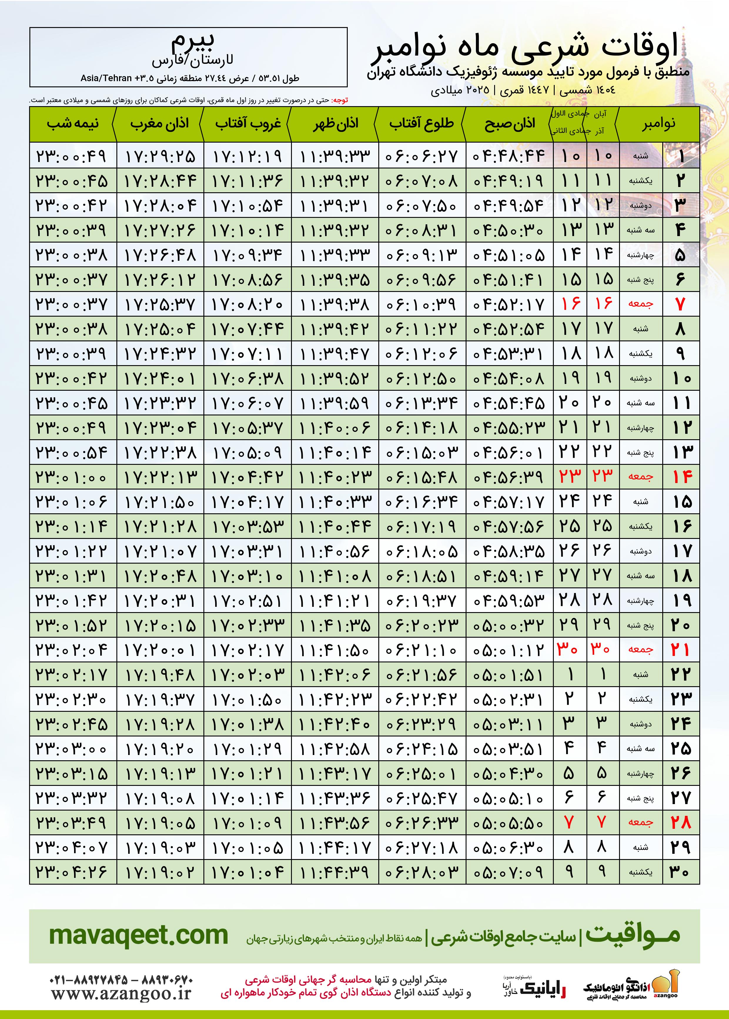 جدول اوقات شرعی نوامبر ٢٠٢٥ میلادی شهر بیرم