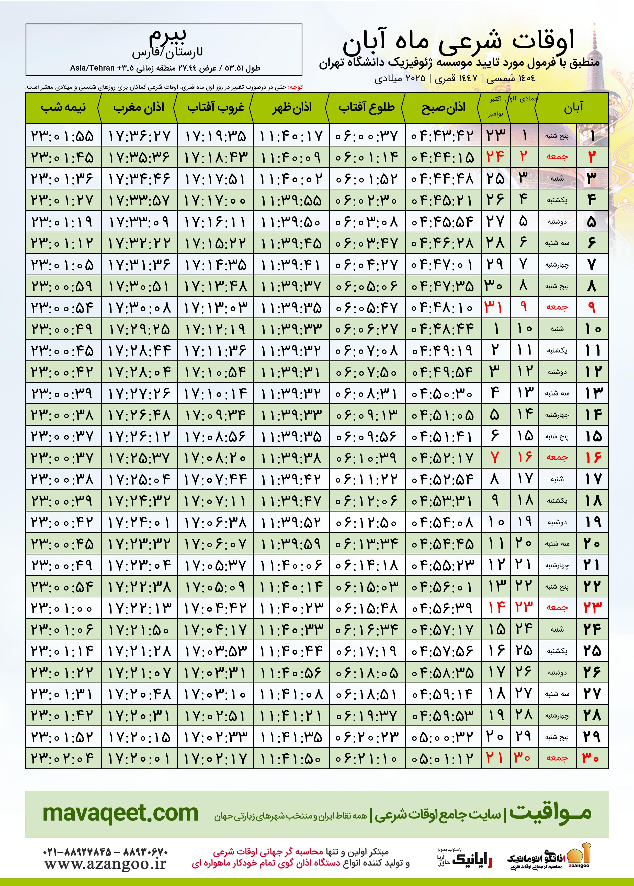 جدول اوقات شرعی آبان ١٤٠٤ شمسی شهر بیرم