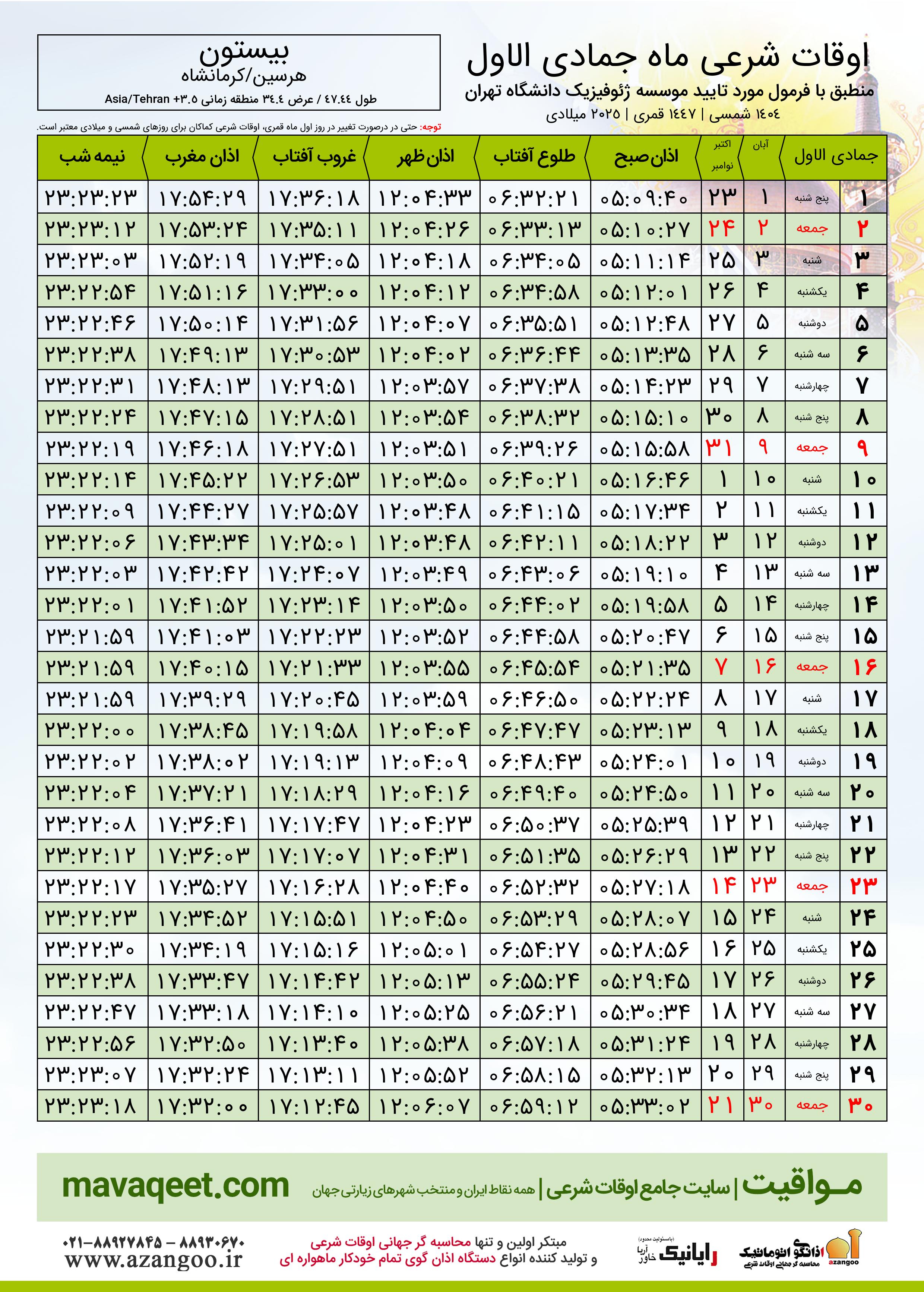 جدول اوقات شرعی جمادی الاول ١٤٤٧ قمری شهر بیستون