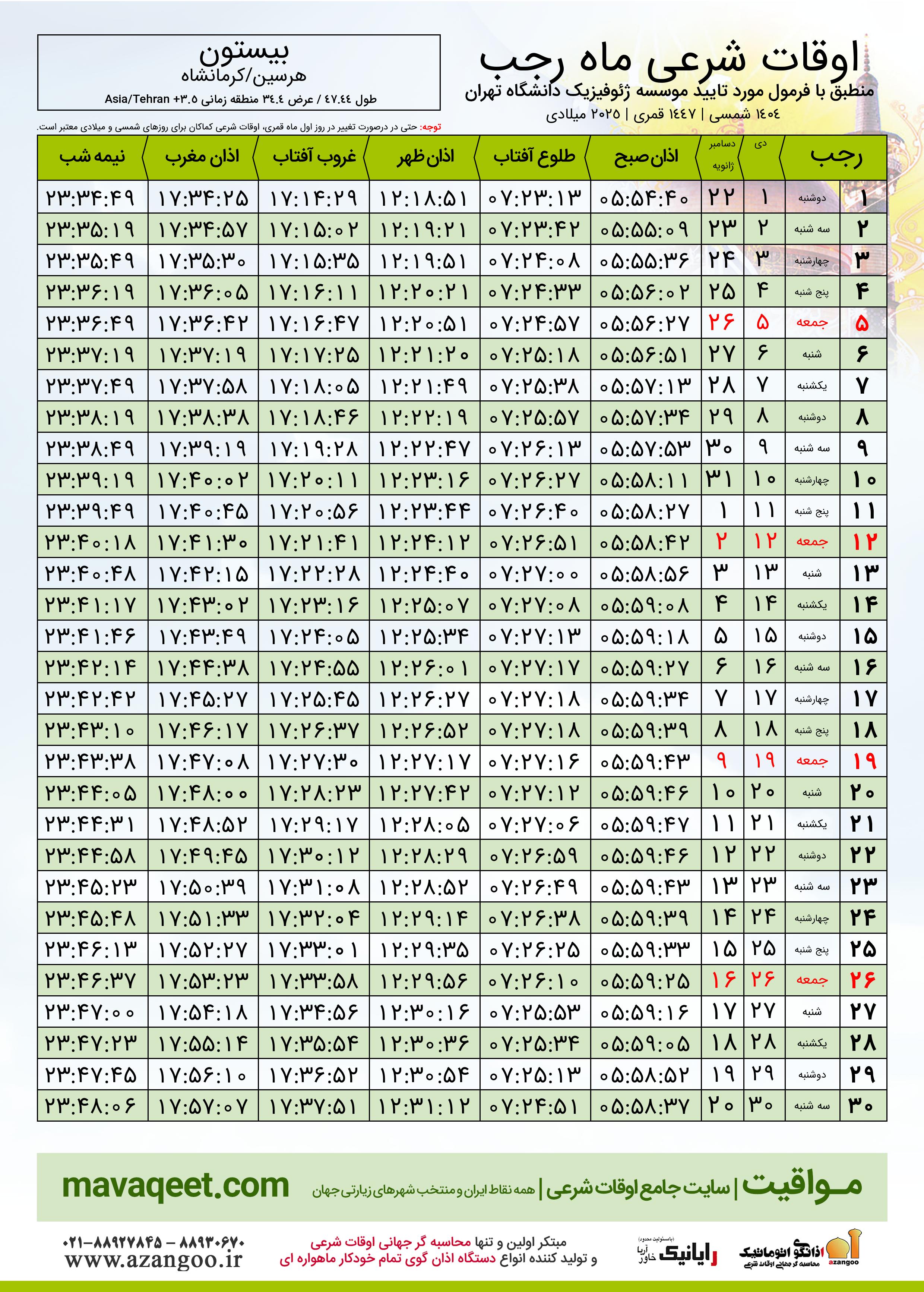 اوقات شرعی ماه رجب ١٤٤٧ هـ.ق شهر بیستون بر