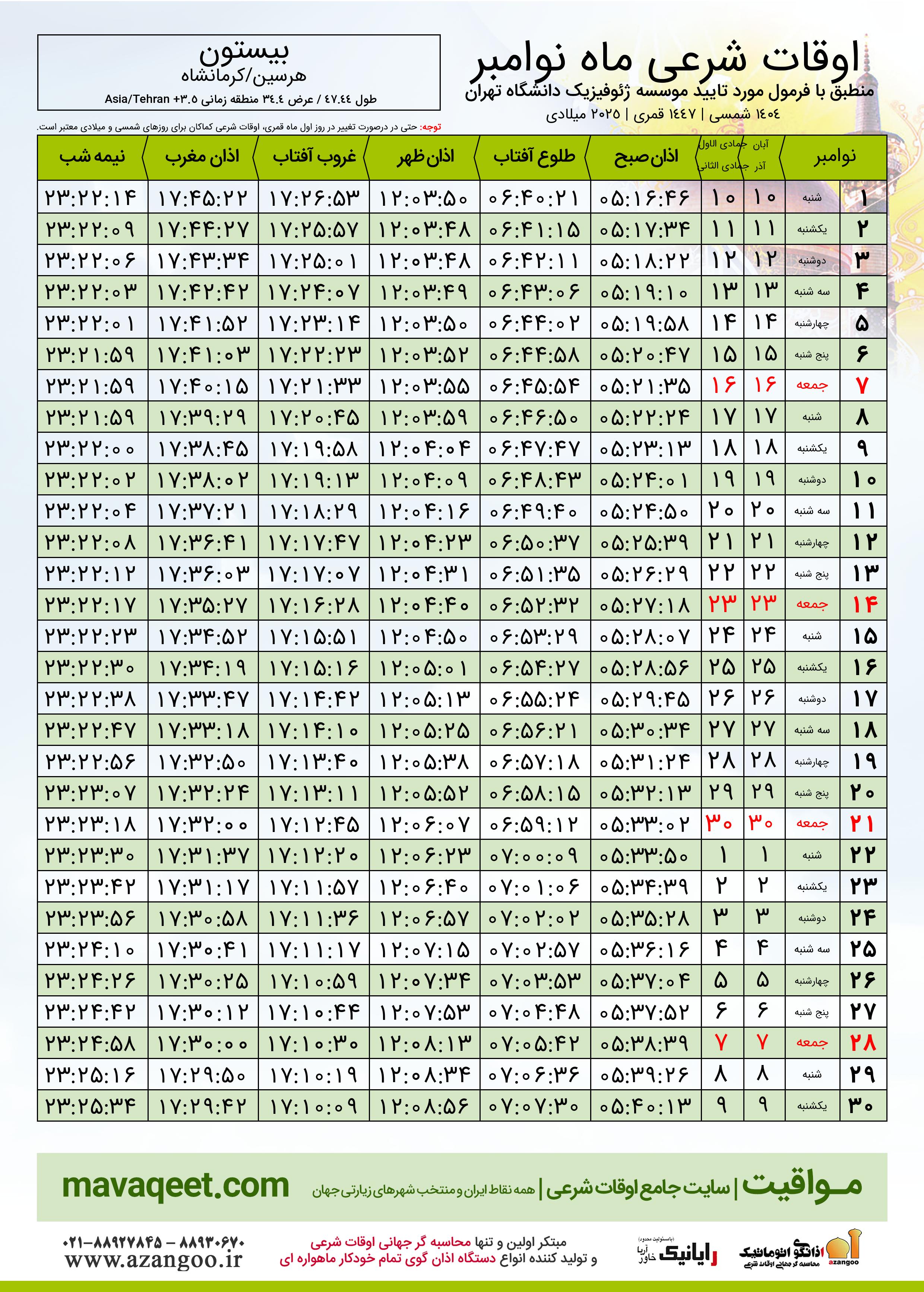 جدول اوقات شرعی نوامبر ٢٠٢٥ میلادی شهر بیستون