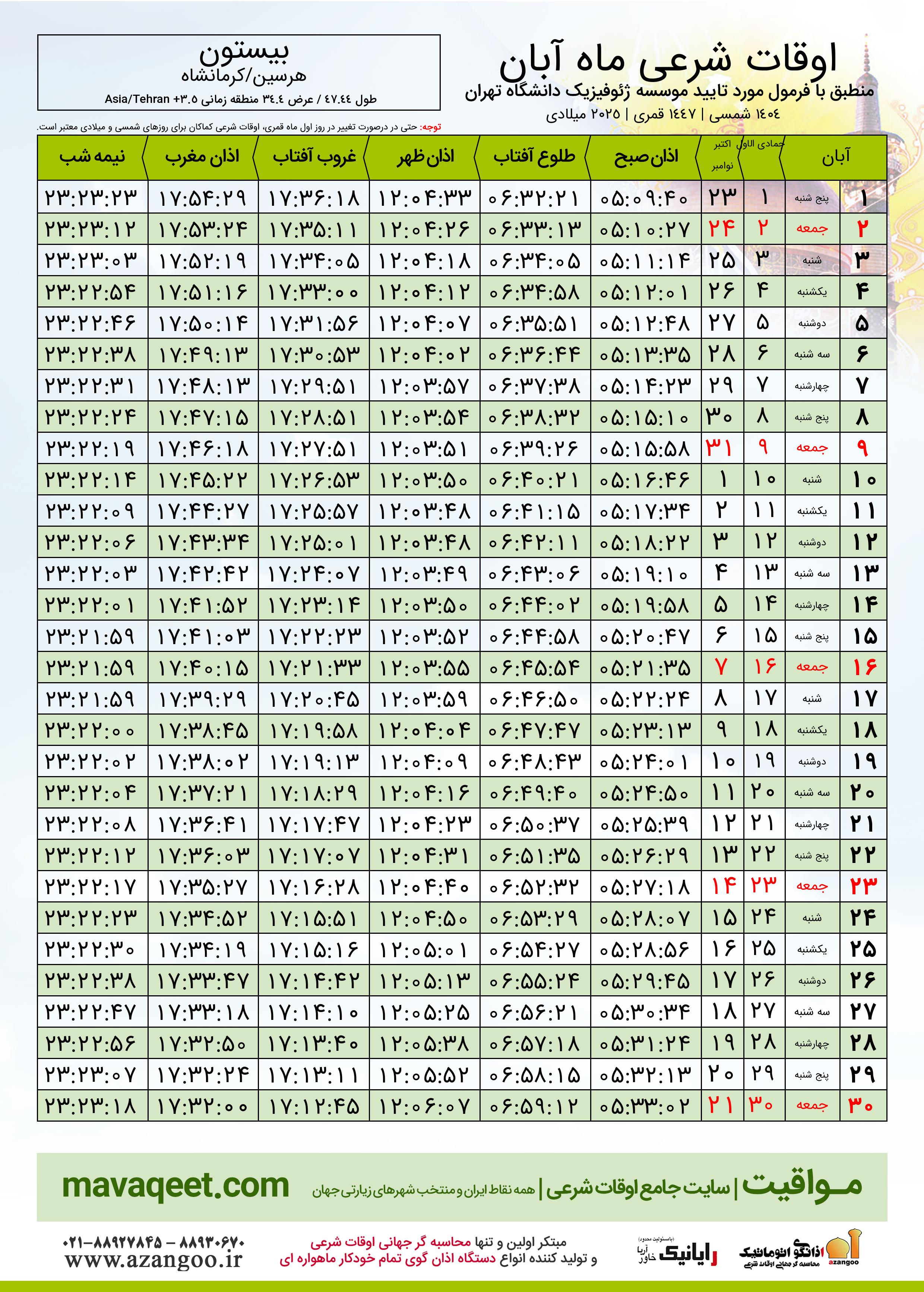 جدول اوقات شرعی آبان ١٤٠٤ شمسی شهر بیستون