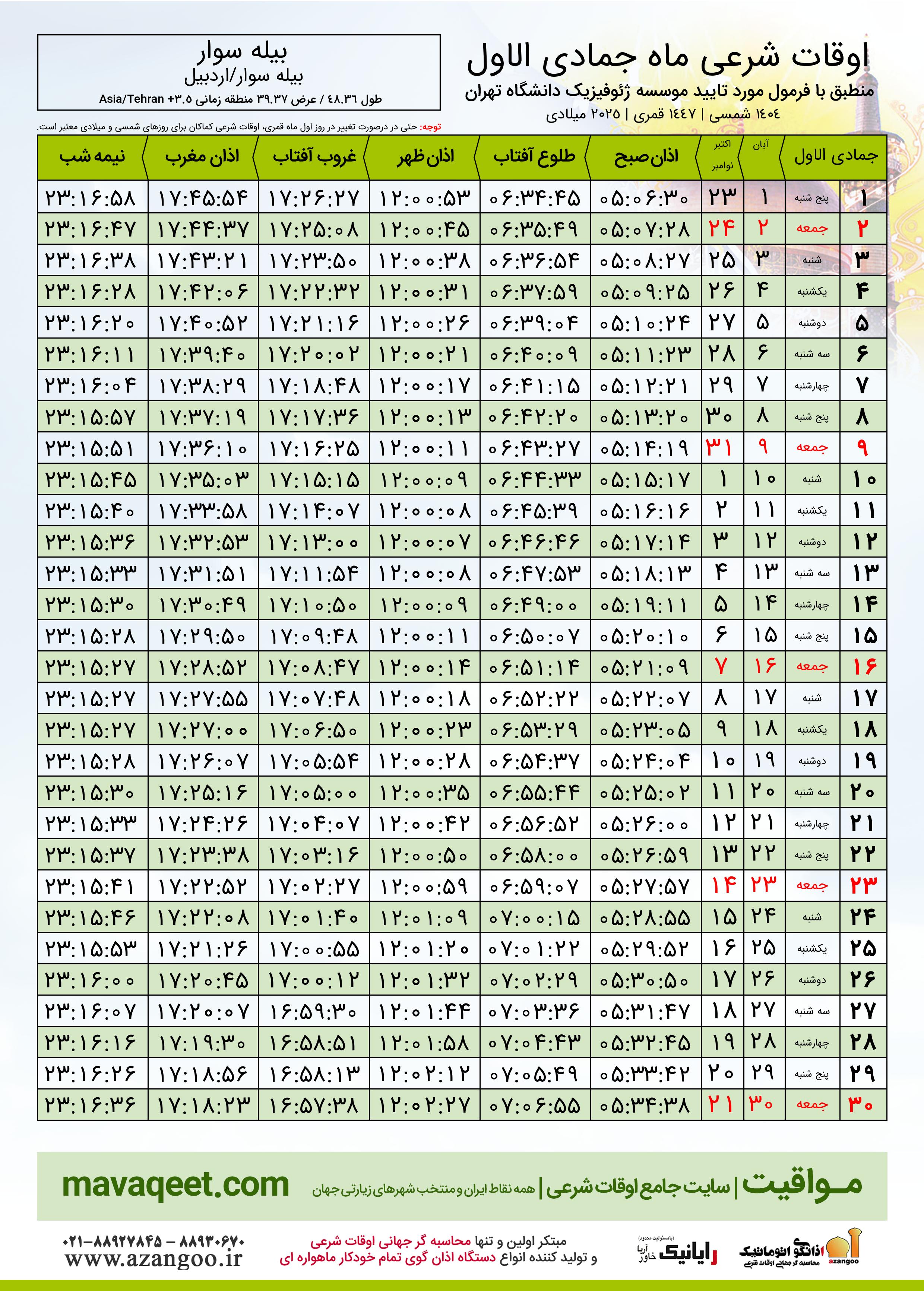 اوقات شرعی ماه جمادی الاول ١٤٤٧ هـ.ق شهر بیله سوار بر