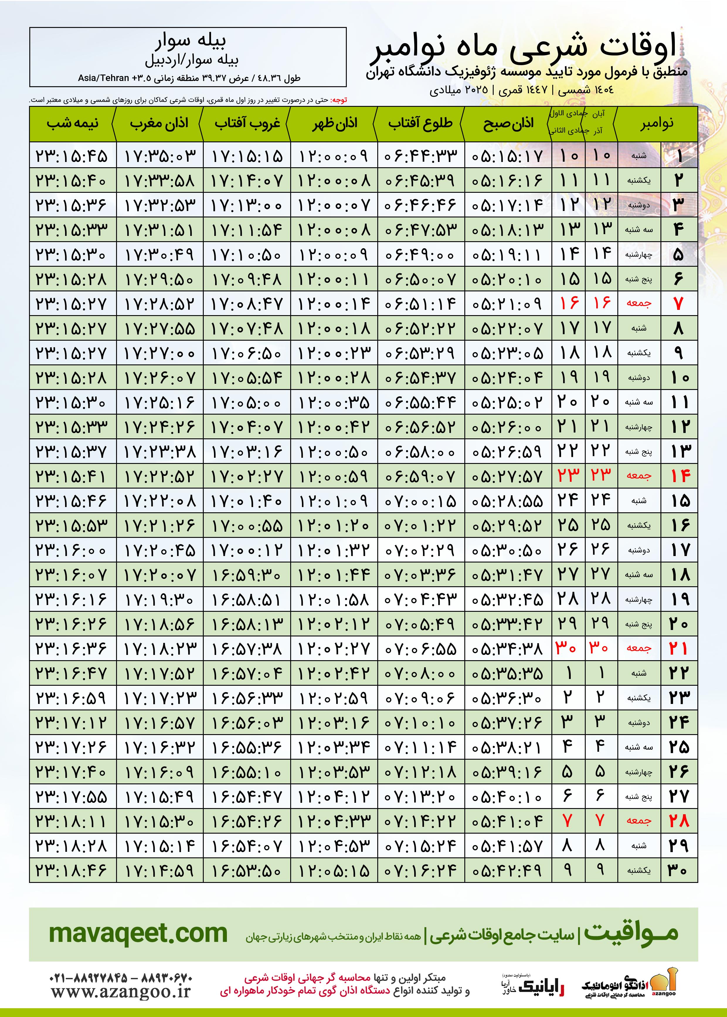 دانلود اوقات شرعی نوامبر ٢٠٢٥ شهر بیله سوار